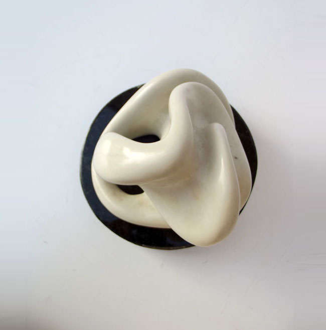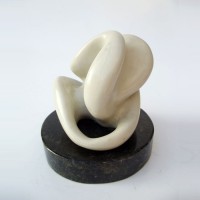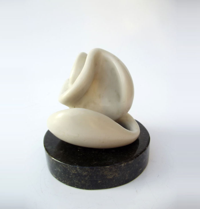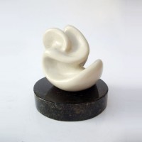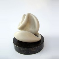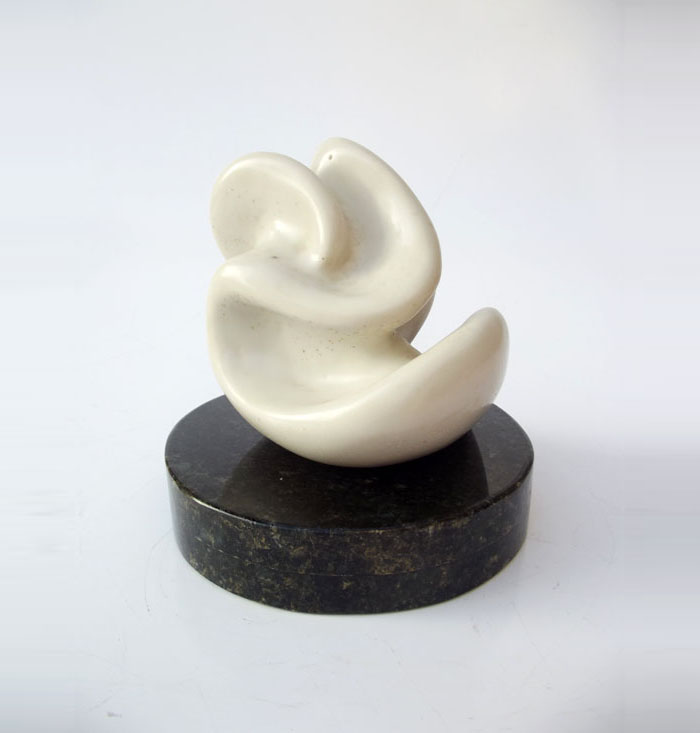 Descrição: Peça maciça em resina de poliéster e pó de mármore (mármore sintético), sobre base de granito (peça não fixada).