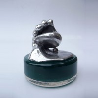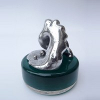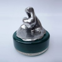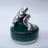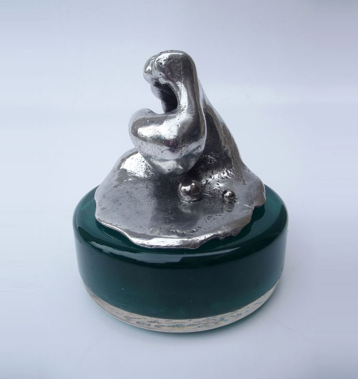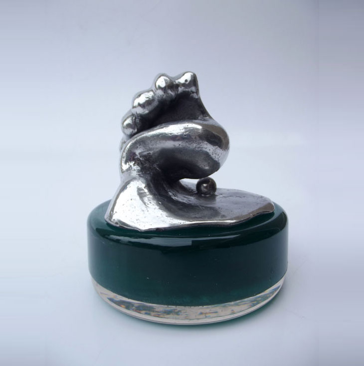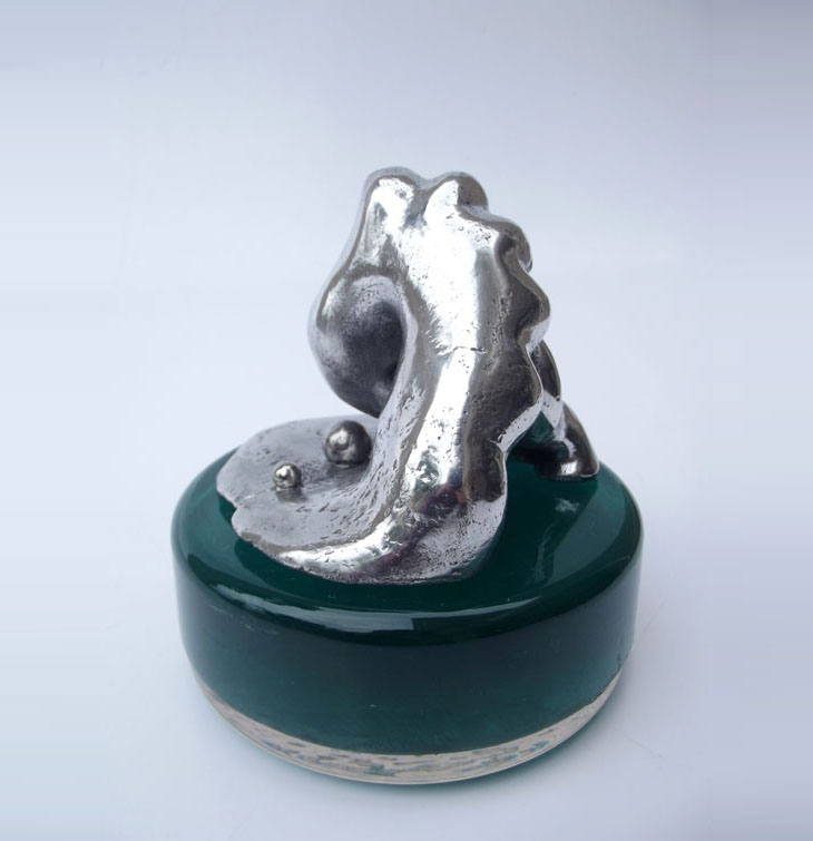 Descrição: Escultura de alumínio polido com aplicação de esferas de aço sobre base de resina de poliéster pigmentada.