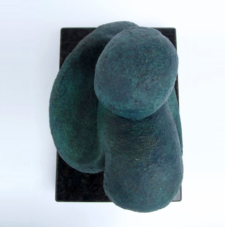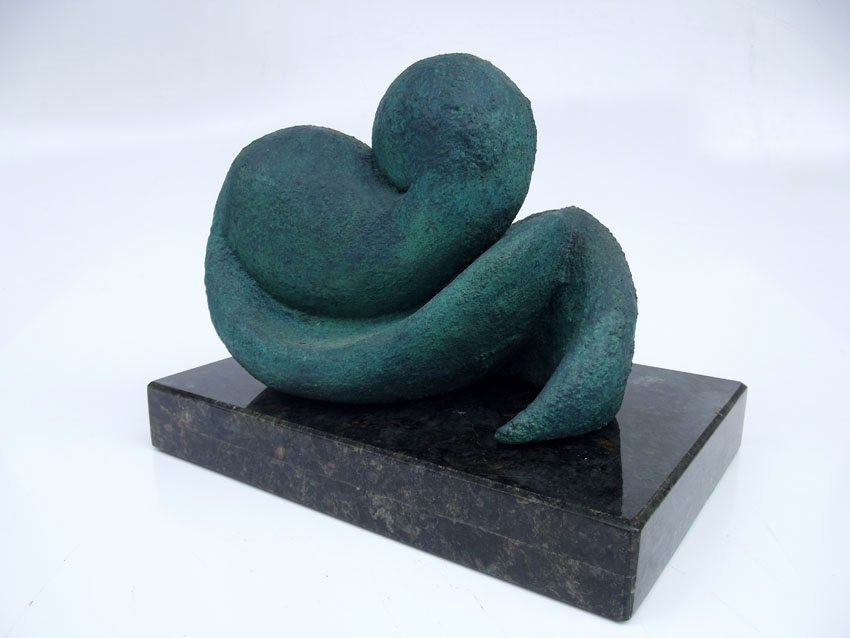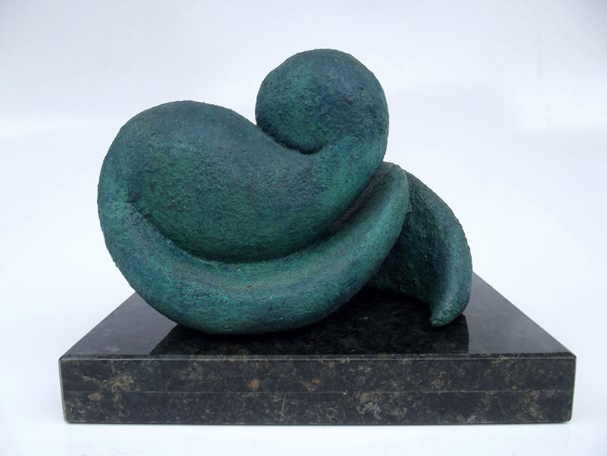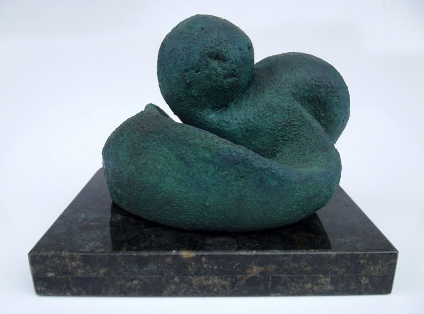 Descrição: Peça maciça em resina de poliéster e pó de mármore (mármore sintético) com película de revestimento em bronze, sobre base de granito (peça não fixada). Pátina quente na tonalidade verde.