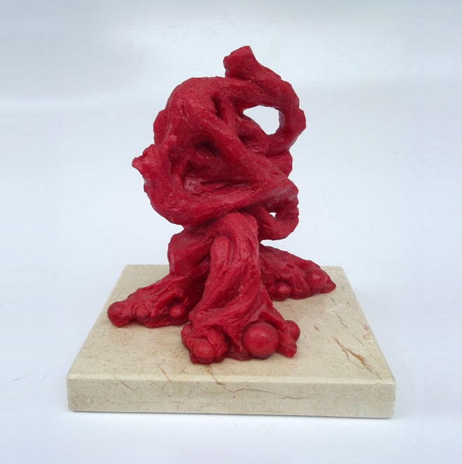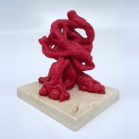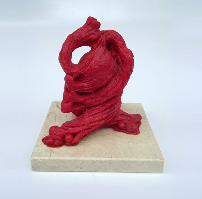 Descrição: Peça maciça em resina de poliéster e sílica vermelha, fixada sobre base de granito.