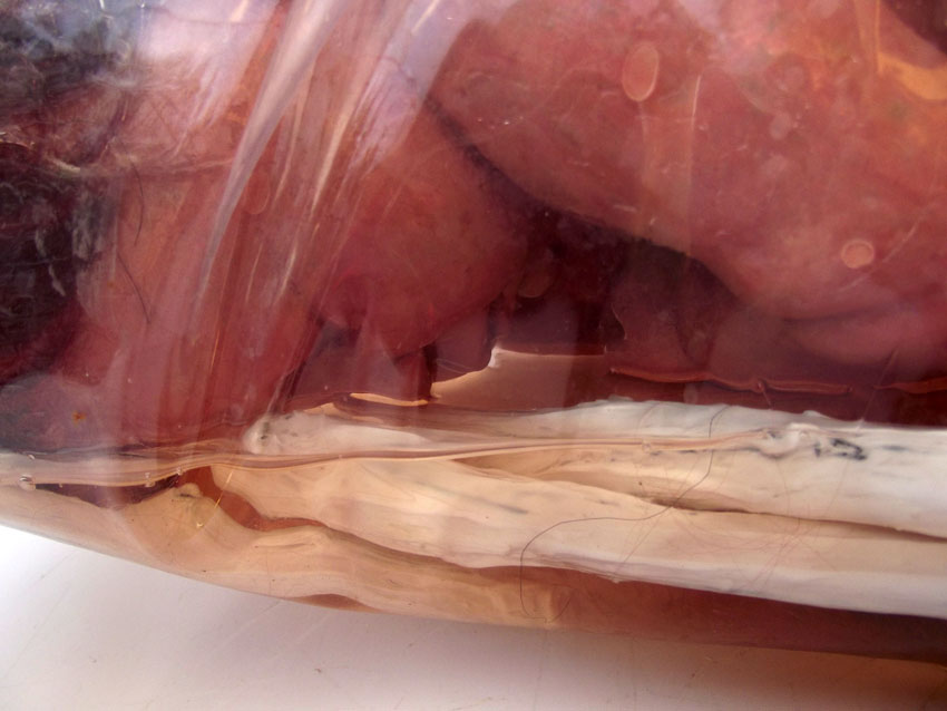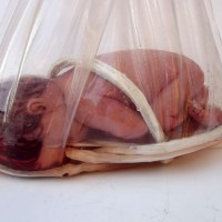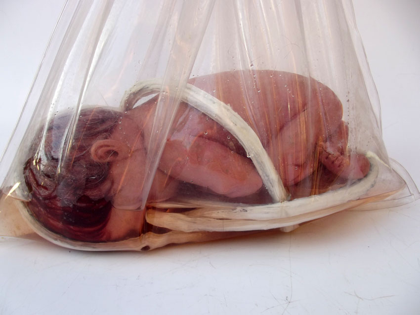 Descrição: Escultura de bebê em resina de poliéster e pó de mármore pigmentado (mármore sintético), cordões de látex e silicone, cabelos de nylon, glicerina e saco plástico transparente selado. Pendurados por cabo de aço com 1,30 m.