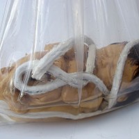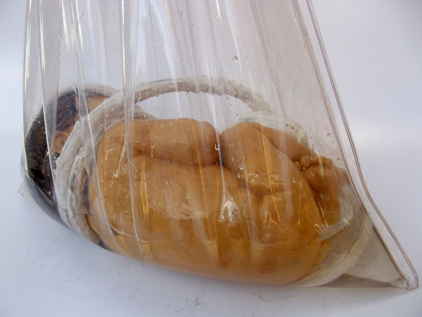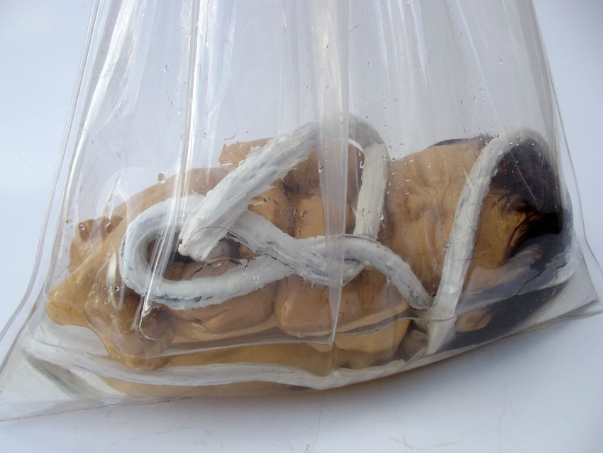Descrição: Escultura de bebê em resina de poliéster e pó de mármore pigmentado (mármore sintético), cordões de látex e silicone, cabelos de nylon, glicerina e saco plástico transparente selado. Pendurados por cabo de aço com 1,30 m.