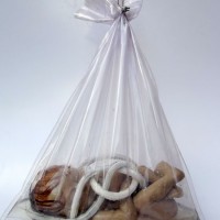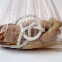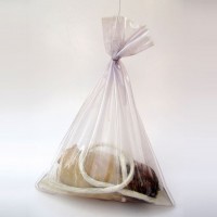 Descrição: Escultura de bebê em resina de poliéster e pó de mármore pigmentado (mármore sintético), cordões de látex e silicone, cabelos de nylon, glicerina e saco plástico transparente selado. Pendurados por cabo de aço com 1,30 m.