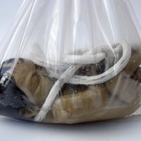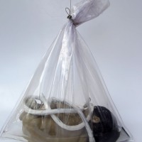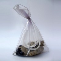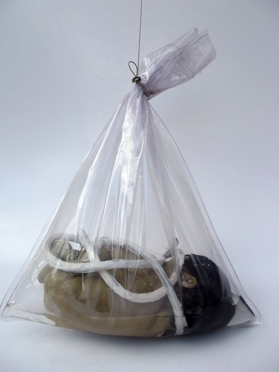 Descrição: Escultura de bebê em resina de poliéster e pó de mármore pigmentado (mármore sintético), cordões de látex e silicone, cabelos de nylon, glicerina e saco plástico transparente selado. Pendurados por cabo de aço com 1,30 m.