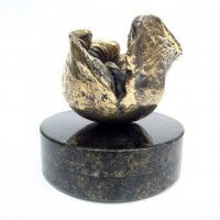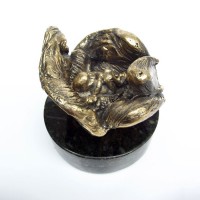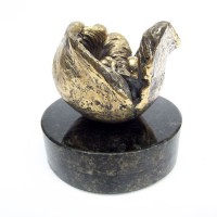 Descrição: Escultura de bronze. Concha com 1 bebê, não fixada à base. Peça em equilíbrio com movimento de pião, girando ao redor de seu próprio eixo sobre base circular de granito. Peça não fixada. Pátina quente em tons dourado e grafite.