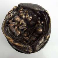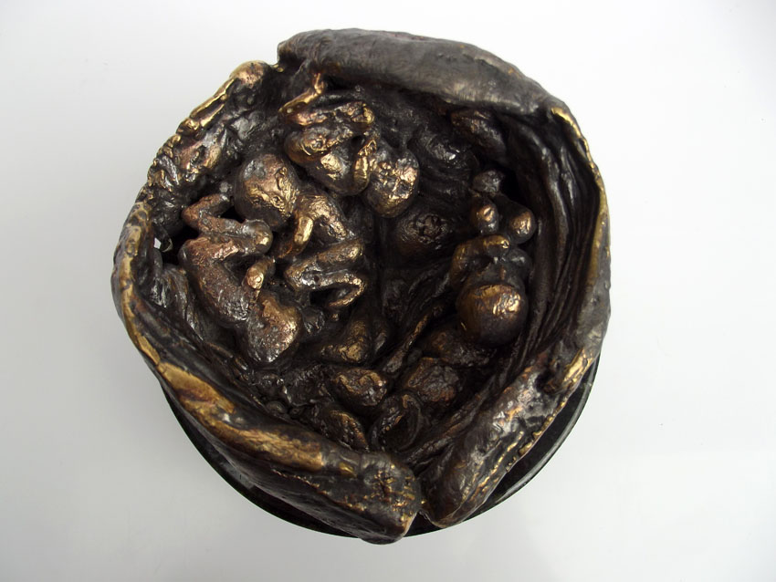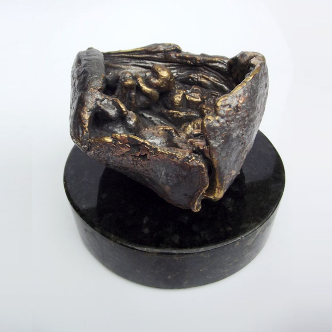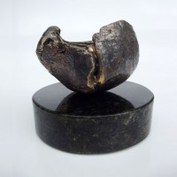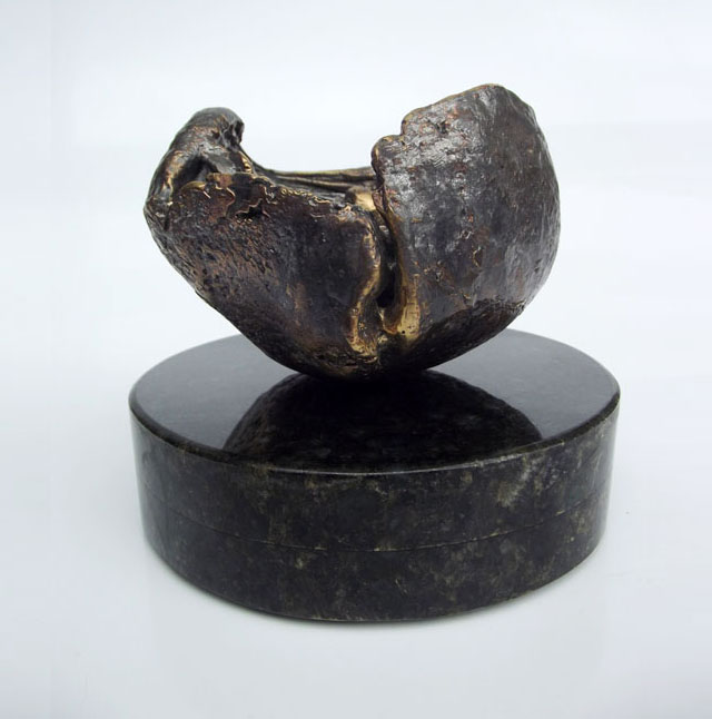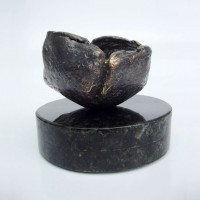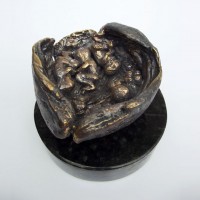 Descrição: Escultura de bronze. Concha com 4 bebês. Peça em equilíbrio com movimento de pião, girando ao redor de seu próprio eixo sobre base circular de granito.