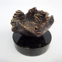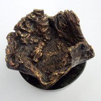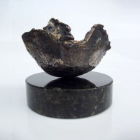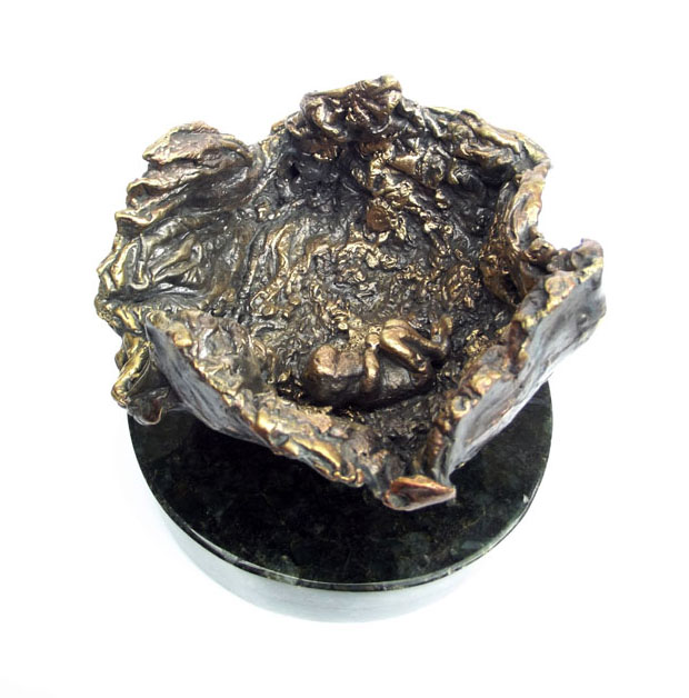 Descrição: Escultura de bronze. Concha com 1 bebê. Peça em equilíbrio com movimento de pião, girando ao redor de seu próprio eixo sobre base circular de granito.