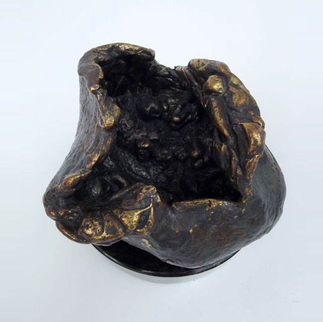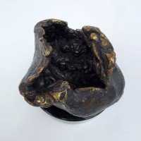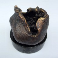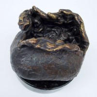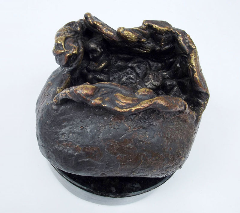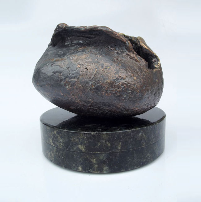 Descrição: Escultura de bronze. Concha com 5 bebês. Peça em equilíbrio com movimento de pião, girando ao redor de seu próprio eixo sobre base circular de granito.