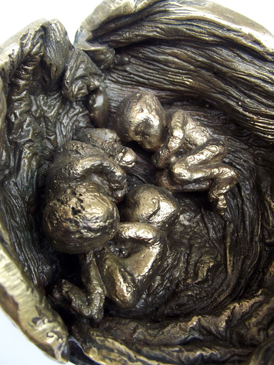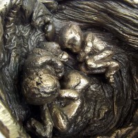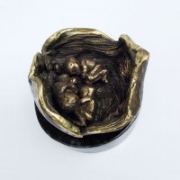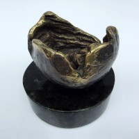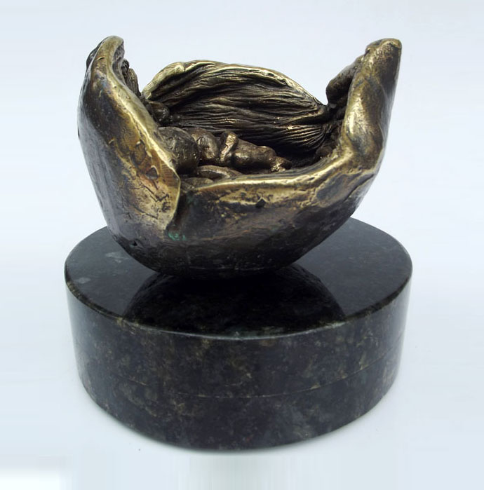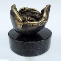 Descrição: Escultura de bronze. Concha com 3 bebês. Peça em equilíbrio com movimento de pião, girando ao redor de seu próprio eixo sobre base circular de granito.