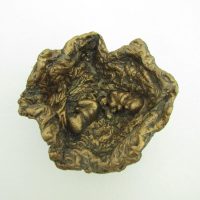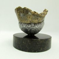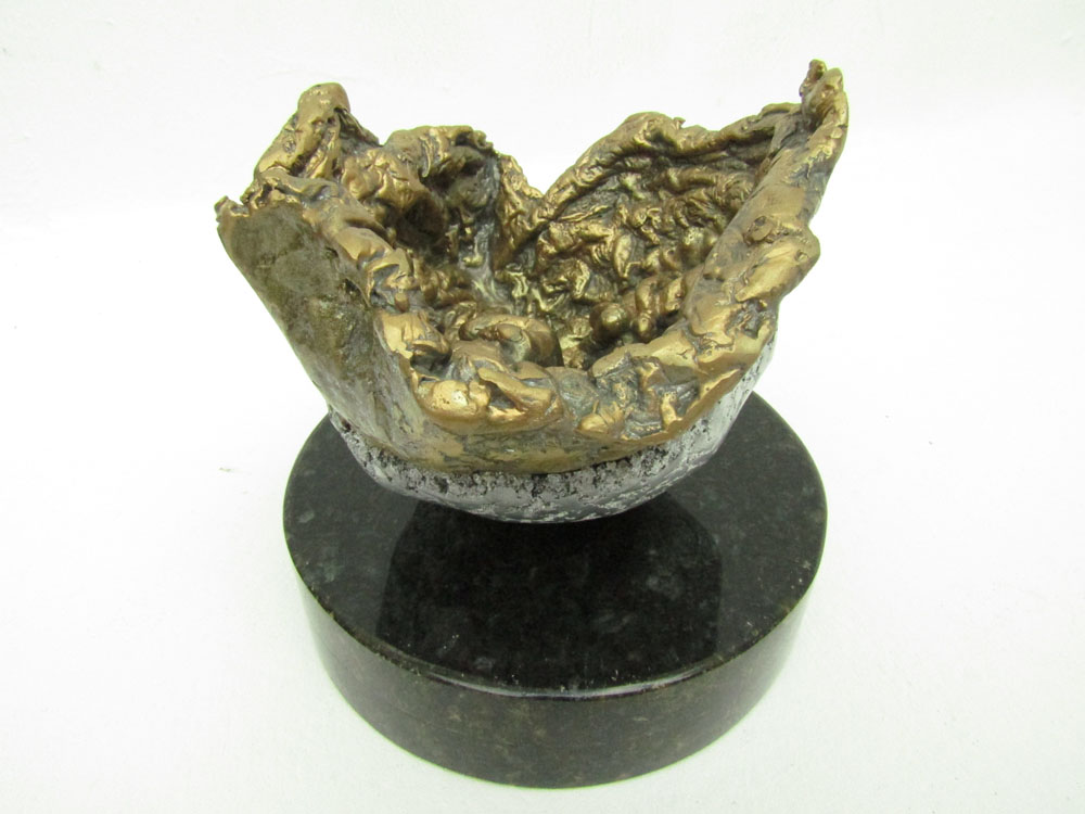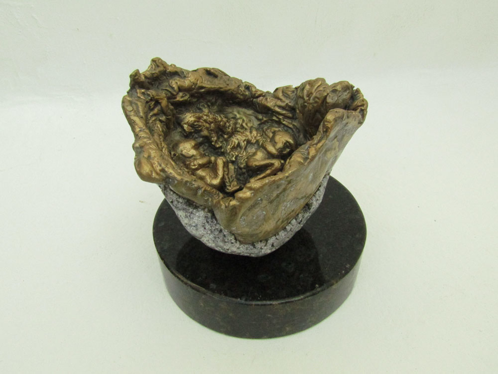 Descrição: Escultura de bronze e alumínio. Concha com 2 bebês, não fixada à base. Peça em equilíbrio com movimento de pião, girando ao redor de seu próprio eixo sobre base circular de granito. Peça não fixada.