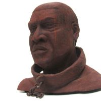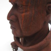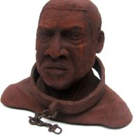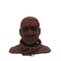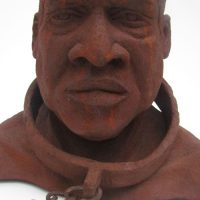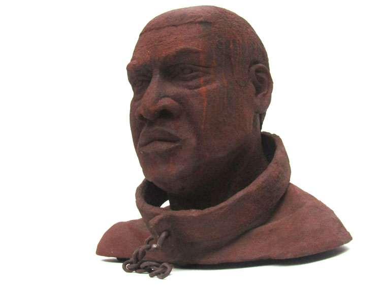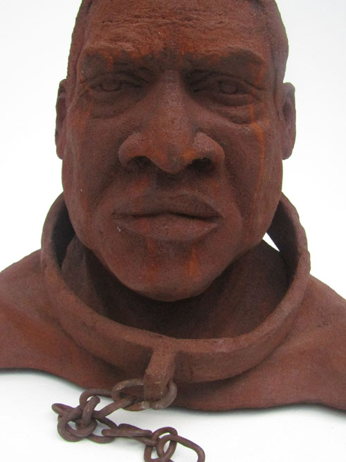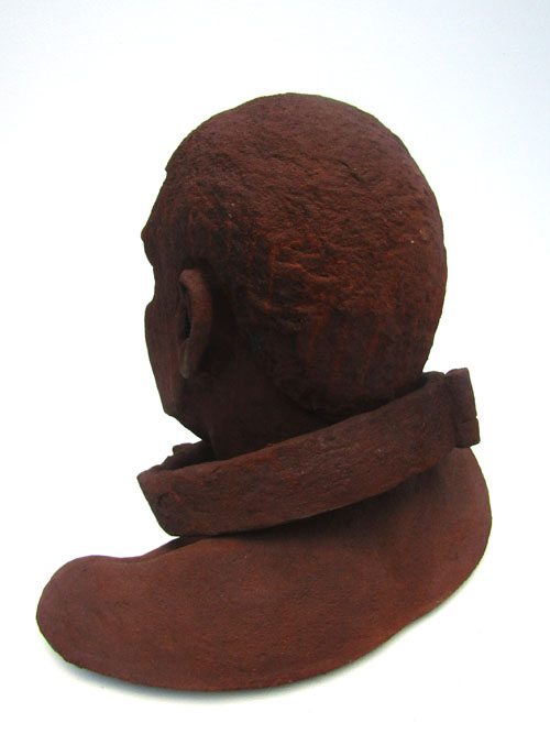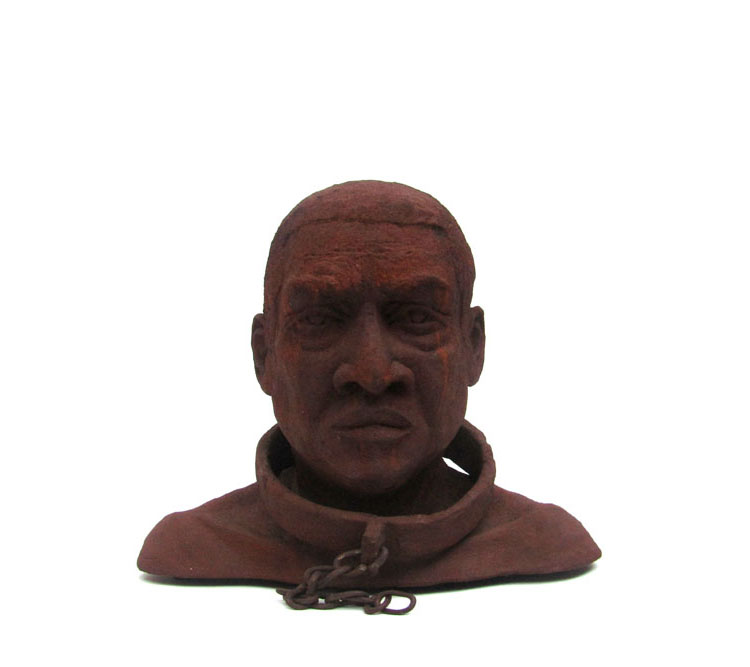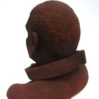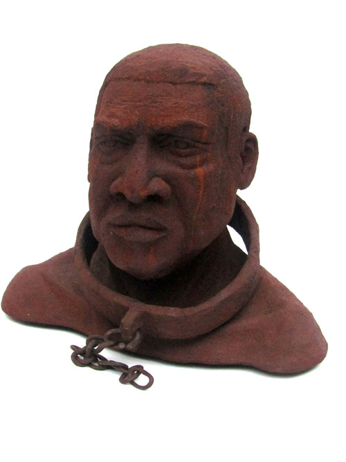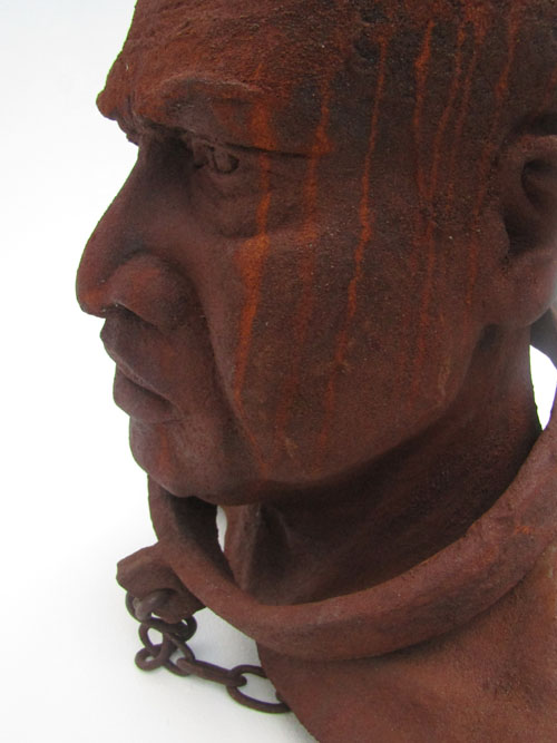 Escravo em resina e fibra de vidro com uma camada de pó de ferro. Pátina natural de ferrugem. Corrente de ferro.