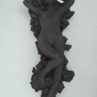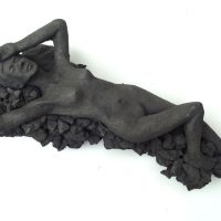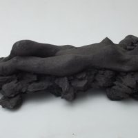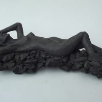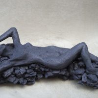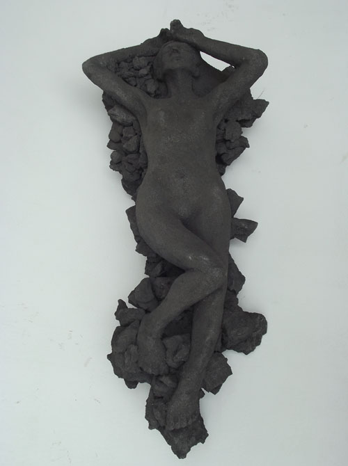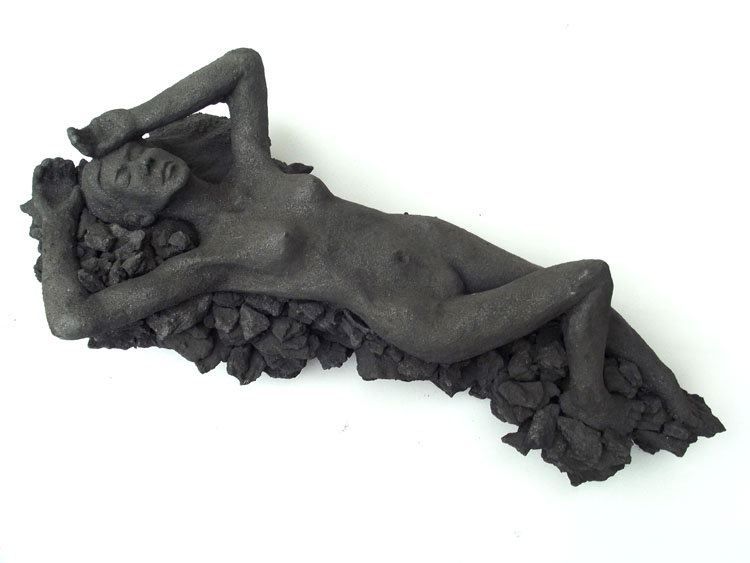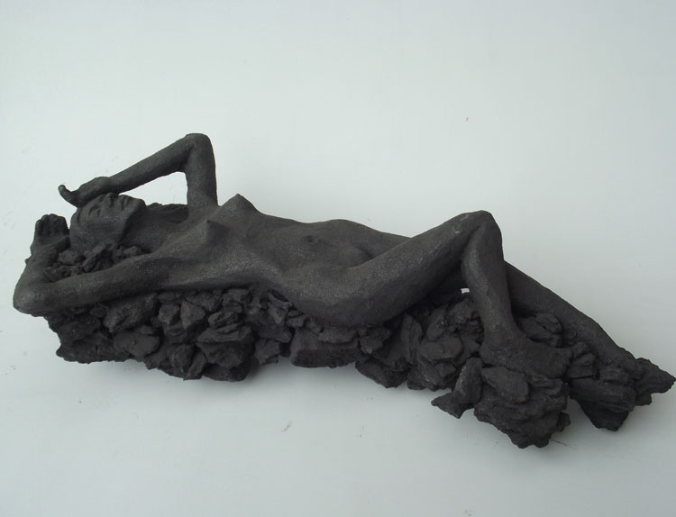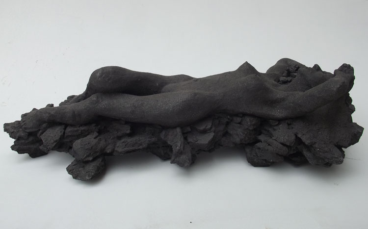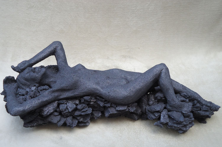 Escultura de resina, fibra de vidro, pó e pedras de grafite de carbono.