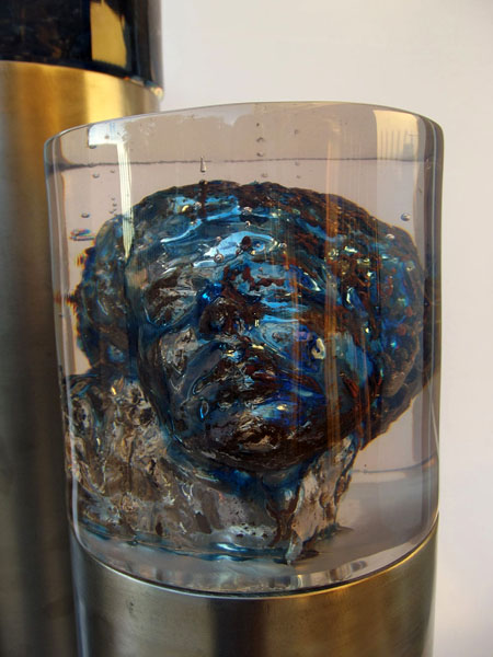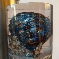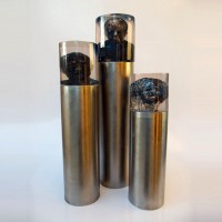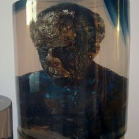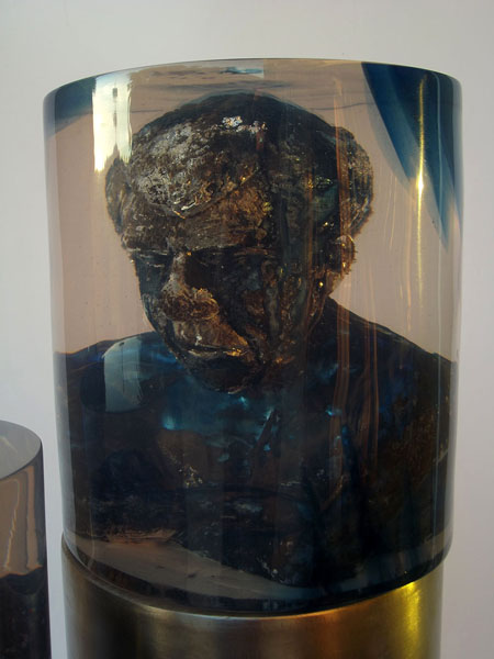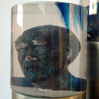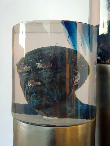 Descrição: Tríptico – cilindros de resina de poliéster cristal, com seu interior ocado na forma de bustos masculinos.