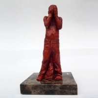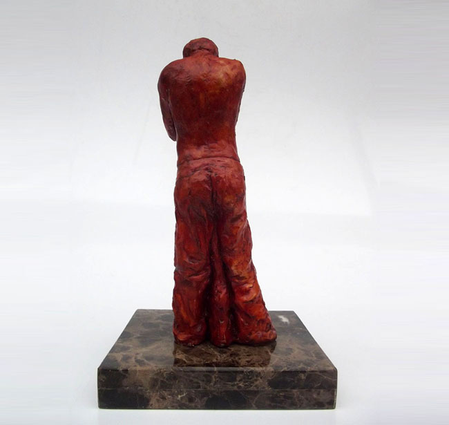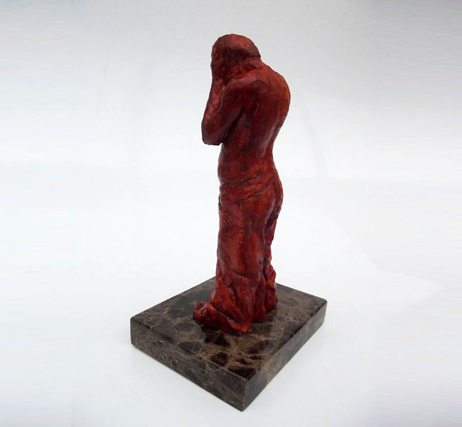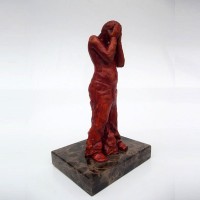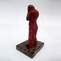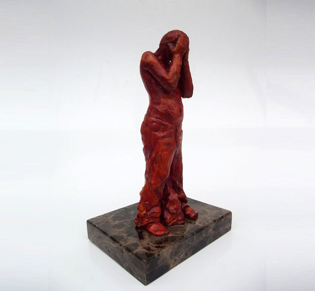 Descrição: Escultura de jovem com as mãos sobre o rosto. Peça maciça em resina de poliéster e pó de mármore (mármore sintético). Fixada sobre base de granito.