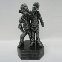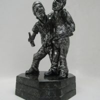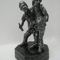 Escultura de resina com base de granito. Peça não fixada. Pátina dourado/preto.
