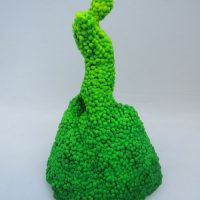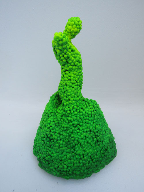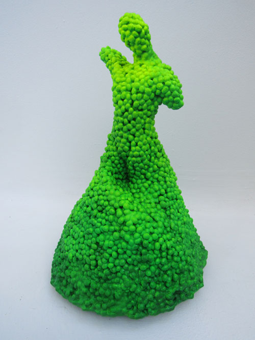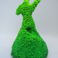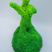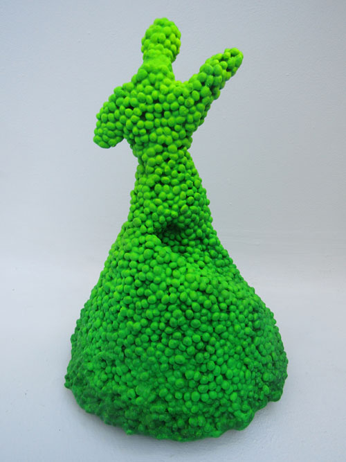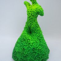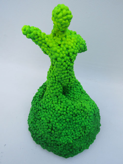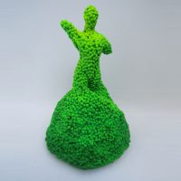 Figura humana construída a partir de grãos de soja, com coloração verde fluorescente indicativa de transgenia.