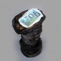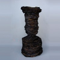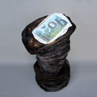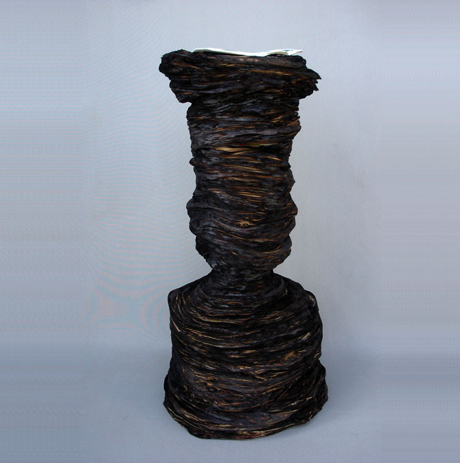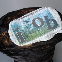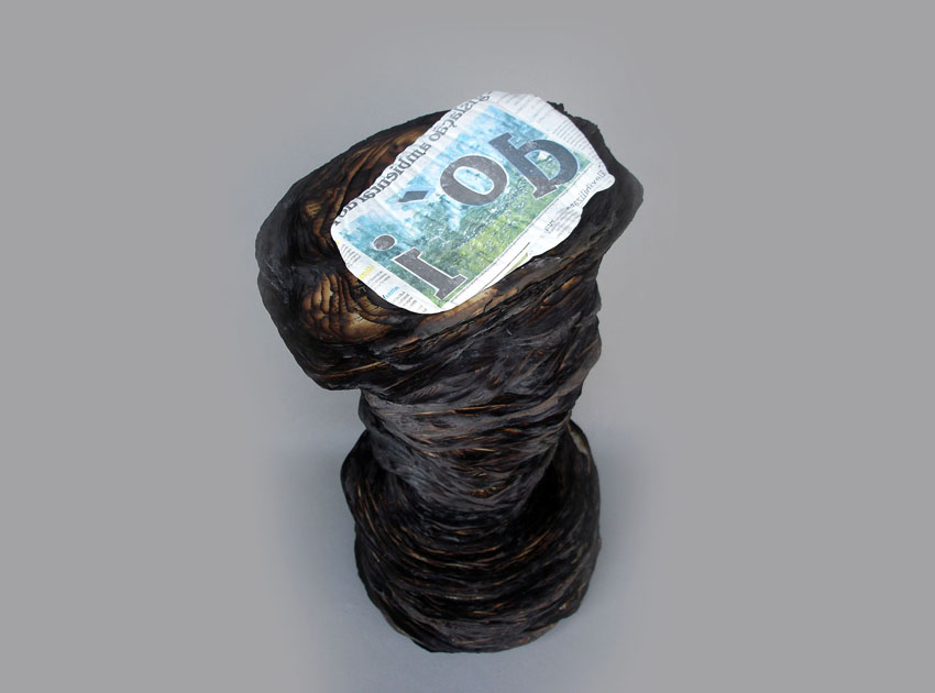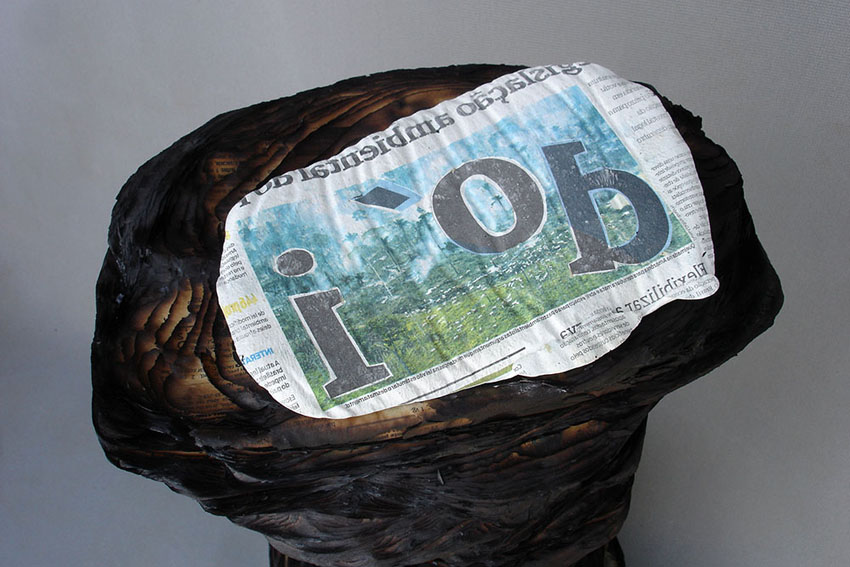 Descrição: Tronco de árvore queimada, construído a partir de de folhas de jornal, tendo ao topo a impressão invertida de uma imagem de floresta incendiada.