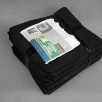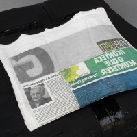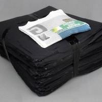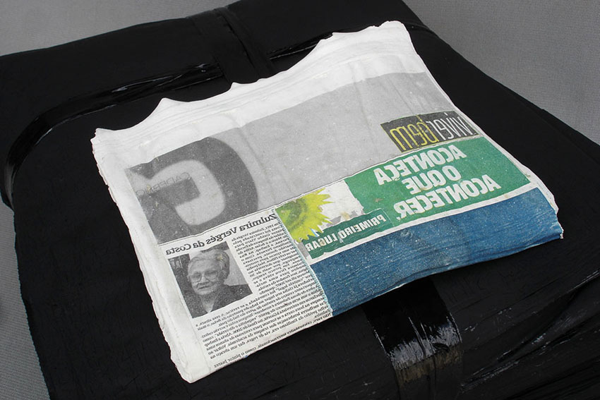 Descrição: Fardo de jornal pintado de preto, tendo ao topo um jornal-escultura, impressão invertida da releitura de jornais.