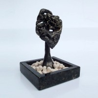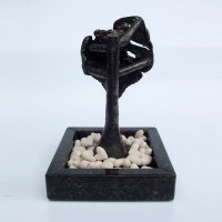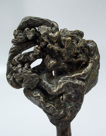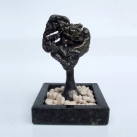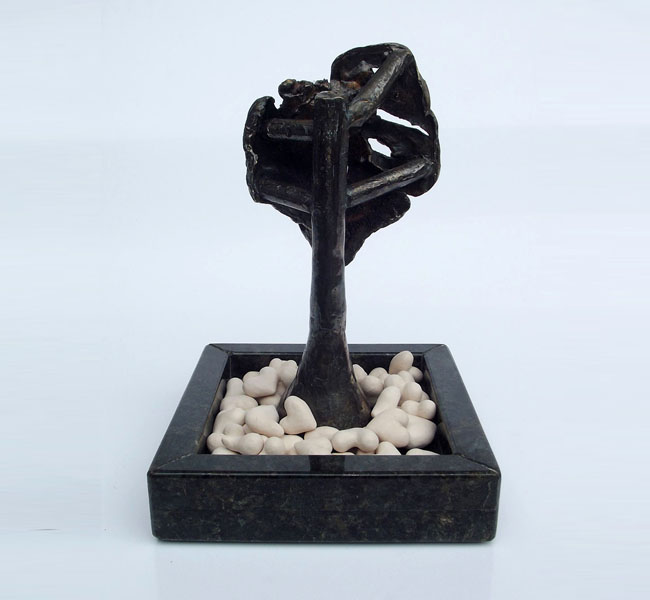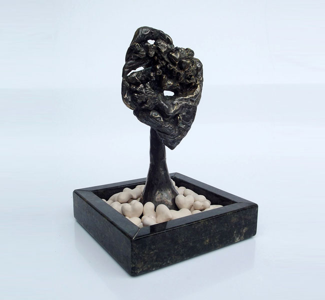 Descrição: Escultura de bronze fixada à base de granito. Sobre a base, 42 corações de cerâmica marfim.