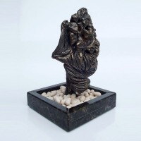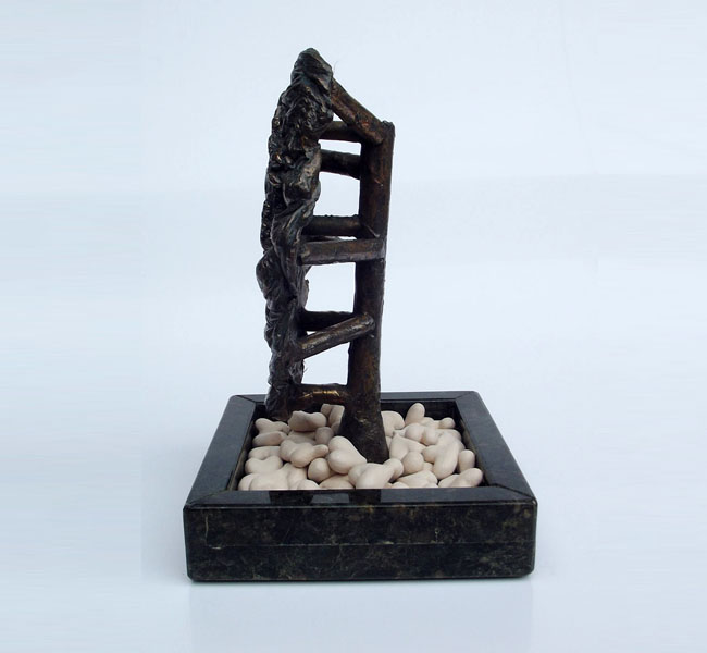 Descrição: Escultura de bronze fixada à base de granito. Sobre a base, 55 corações de cerâmica marfim.