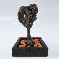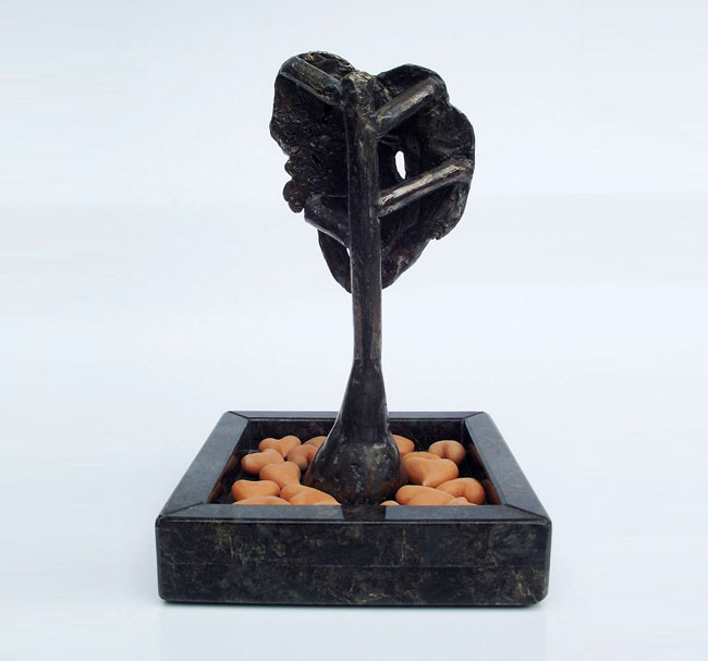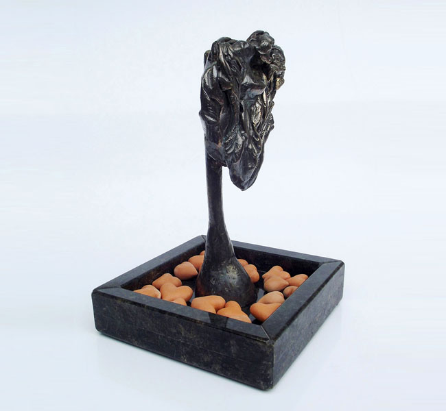Descrição: Escultura de bronze fixada à base de granito. Sobre a base, 18 corações de cerâmica terracota.