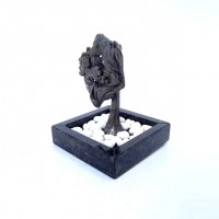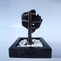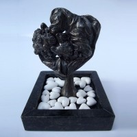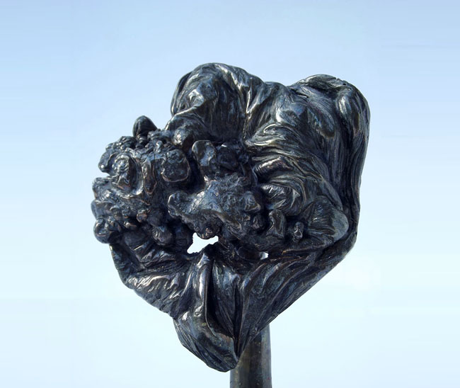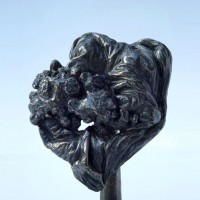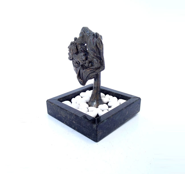 Descrição: Escultura de bronze fixada à base de granito. Sobre a base, 25 corações de porcelana canadense branca
