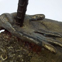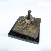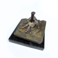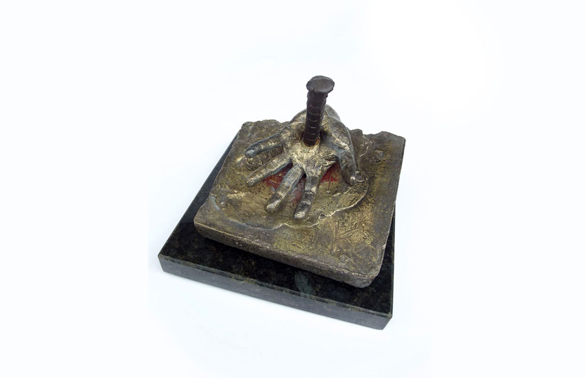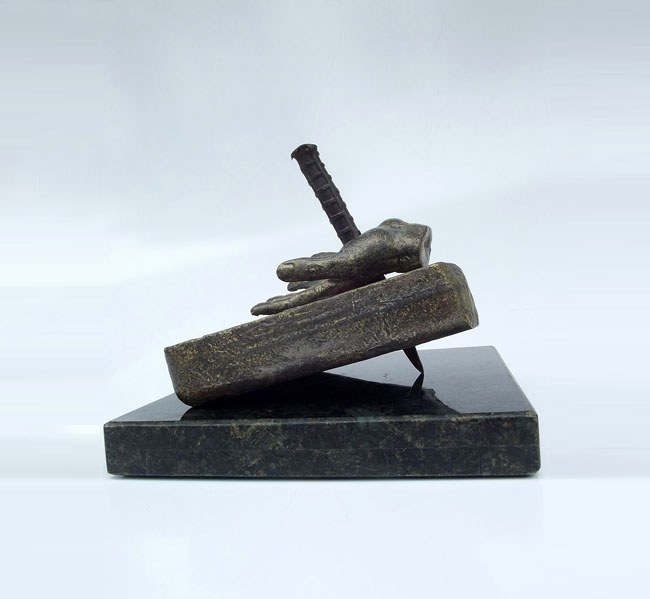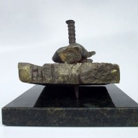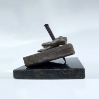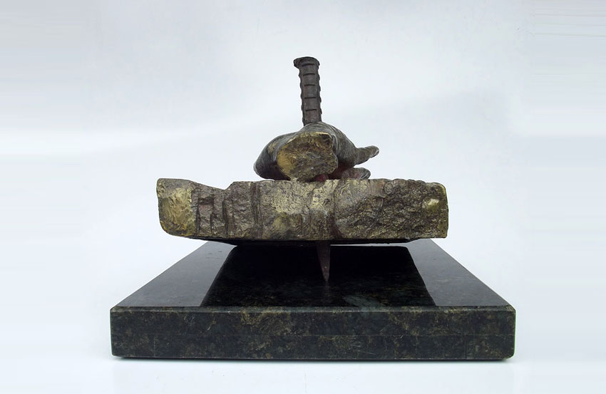 Descrição: Escultura de bronze com vergalhão de ferro. Sobre base de granito (peça não fixada).