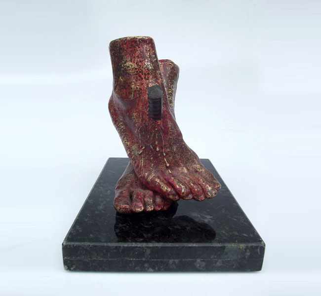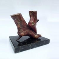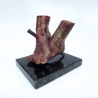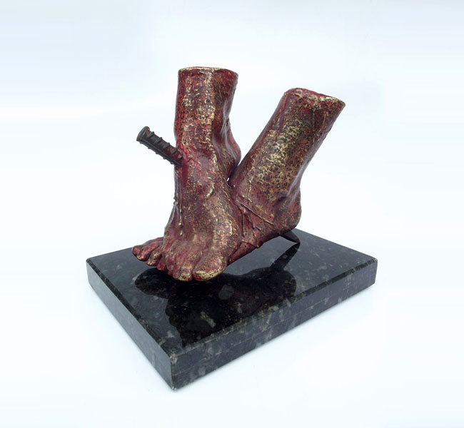 Descrição: Escultura de bronze com vergalhão de ferro, sobre base de granito (peça não fixada). Pátina fria vermelha