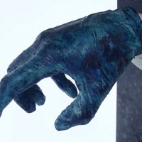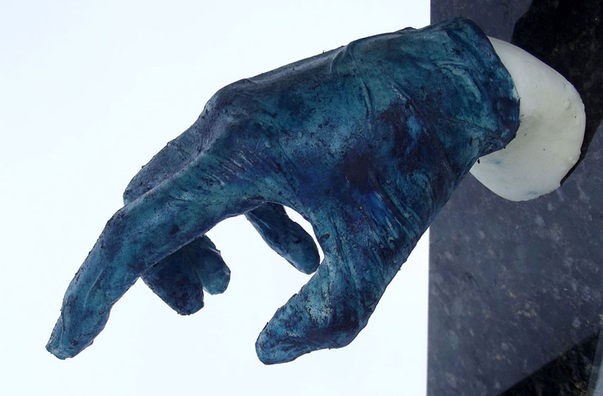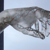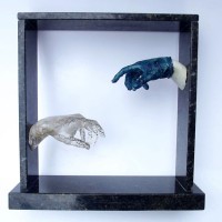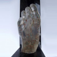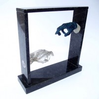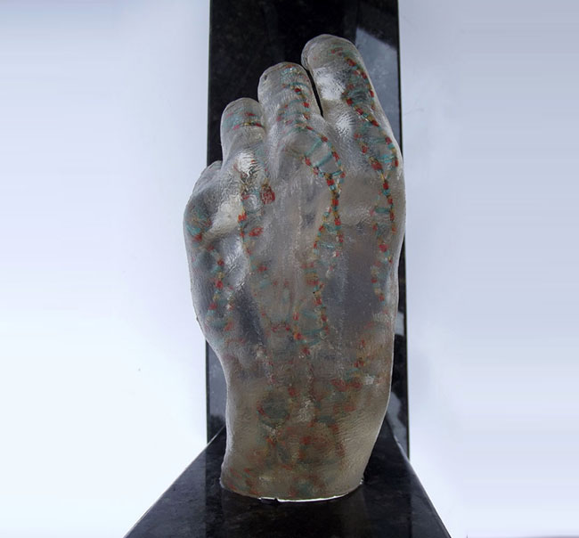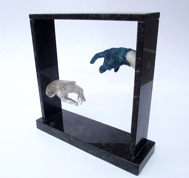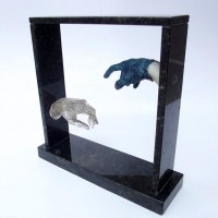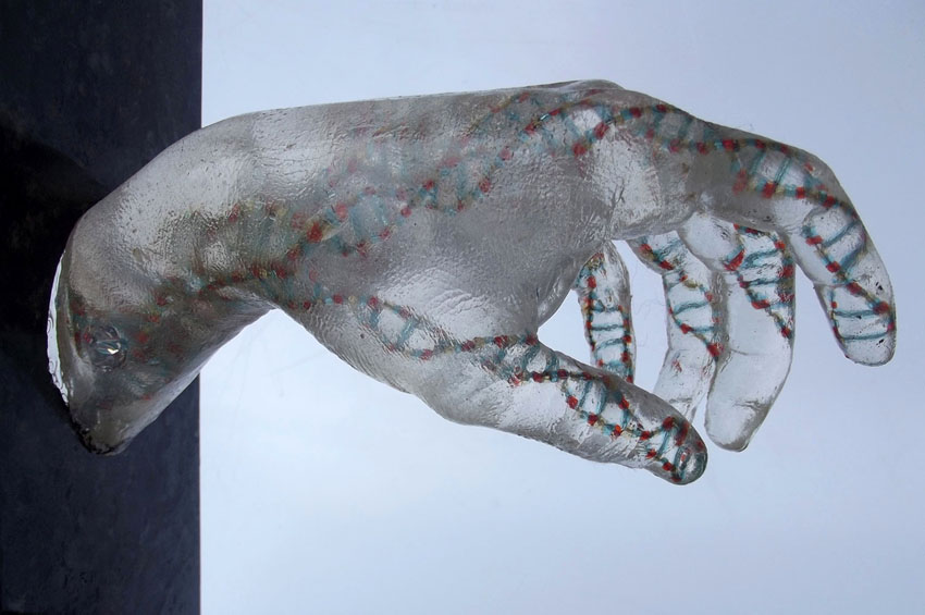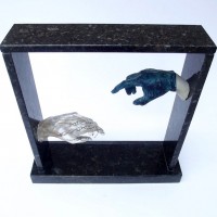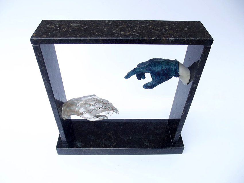 Descrição: Releitura do “Renascimento de Adão”. Duas peças em resina de poliéster, maciças, fixada à “janela” de granito. No interior da peça cristal, contas coloridas formando cadeias de DNA