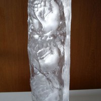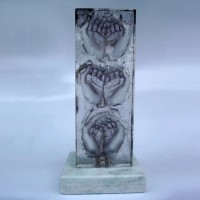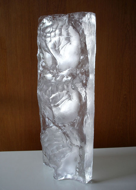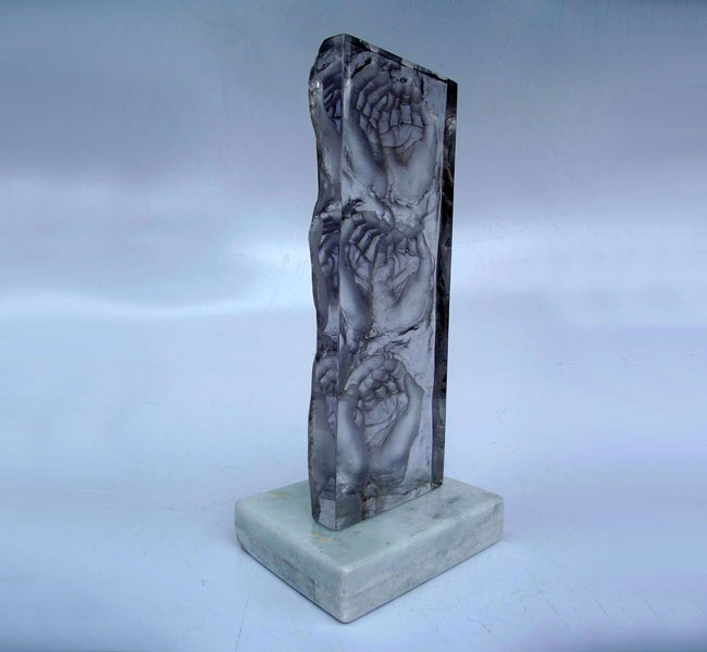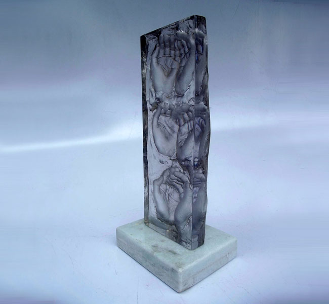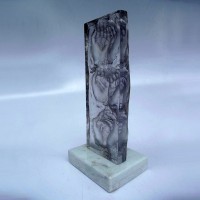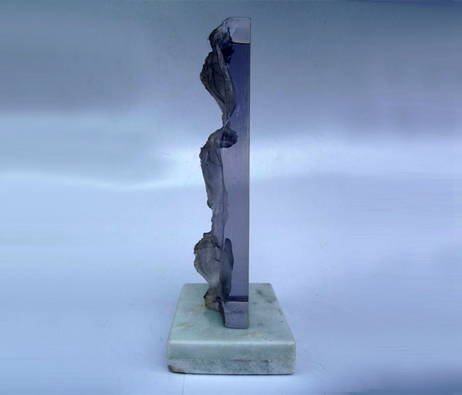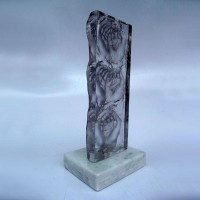 Descrição: Escultura de resina de poliéster cristal, maciça, fixada à base de granito.