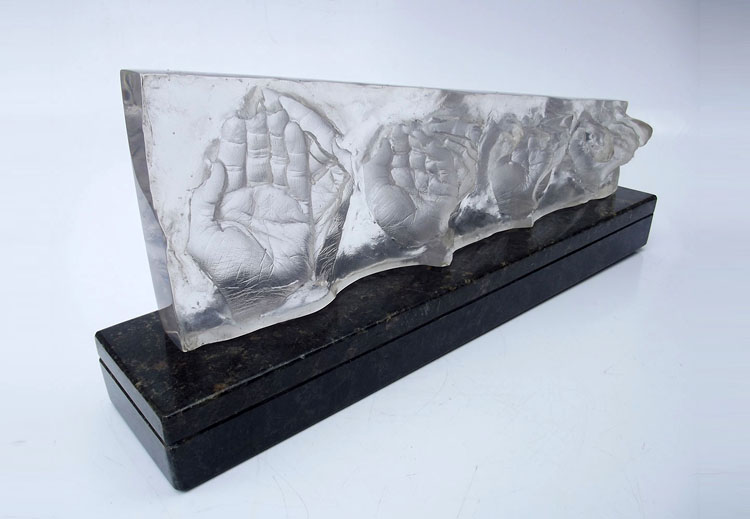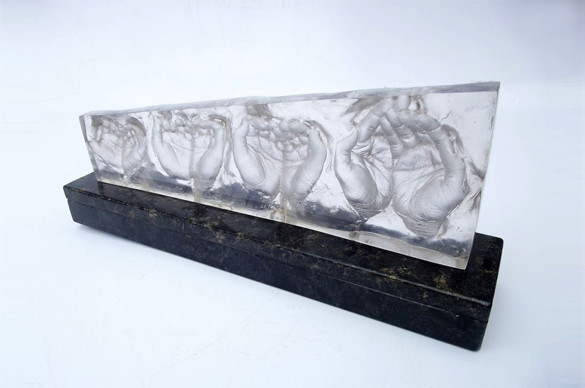 Descrição: Escultura de resina de poliéster cristal, maciça, fixada à base de granito.