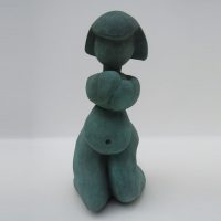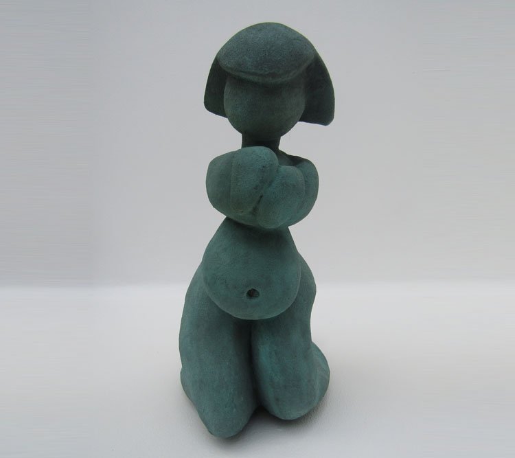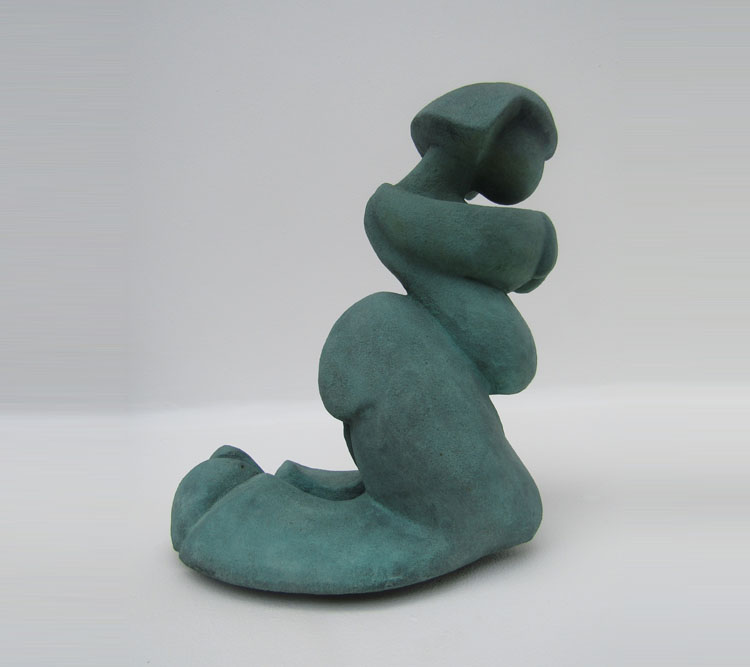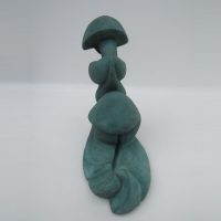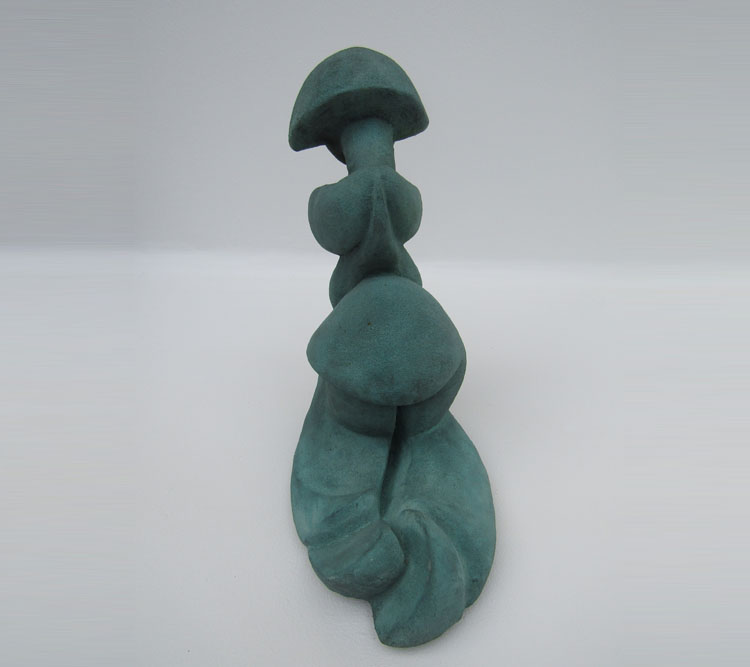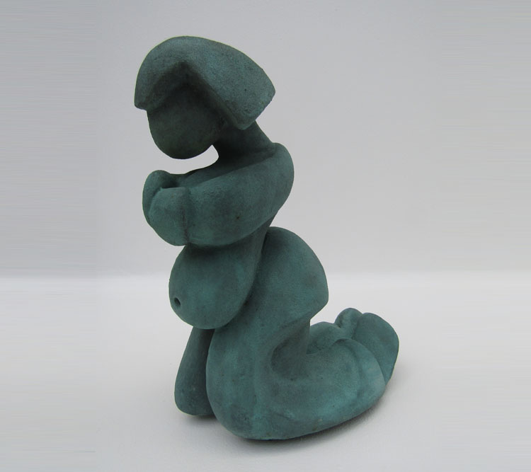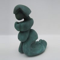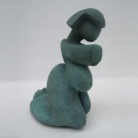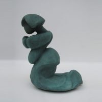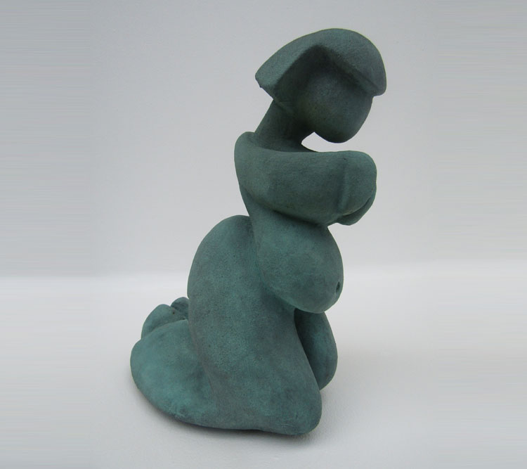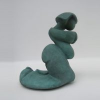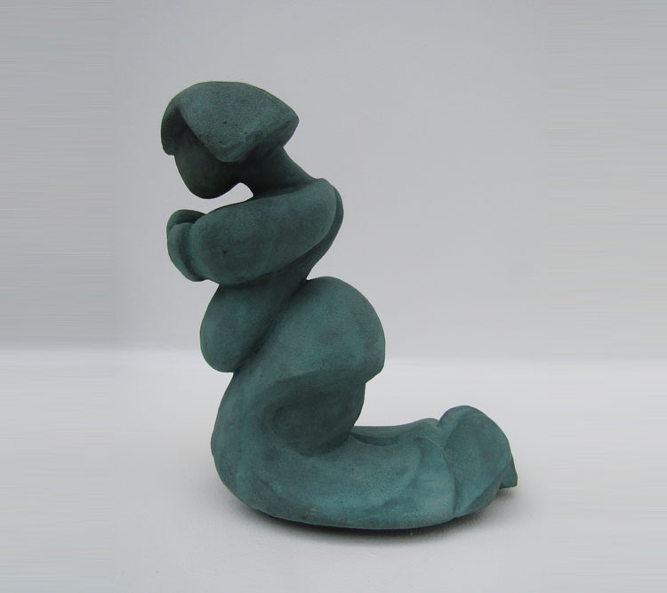 Nú feminino estilizado. Aborda os temas gravidez, sexualidade e religiosidade. Peça em resina coberta com película de bronze com pátina quente verde.