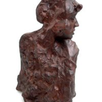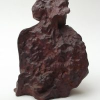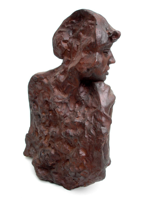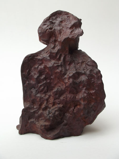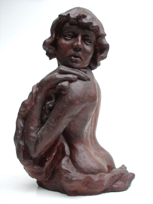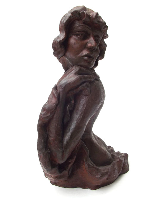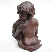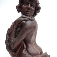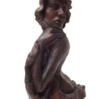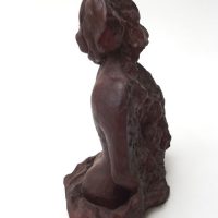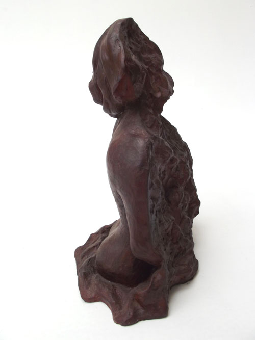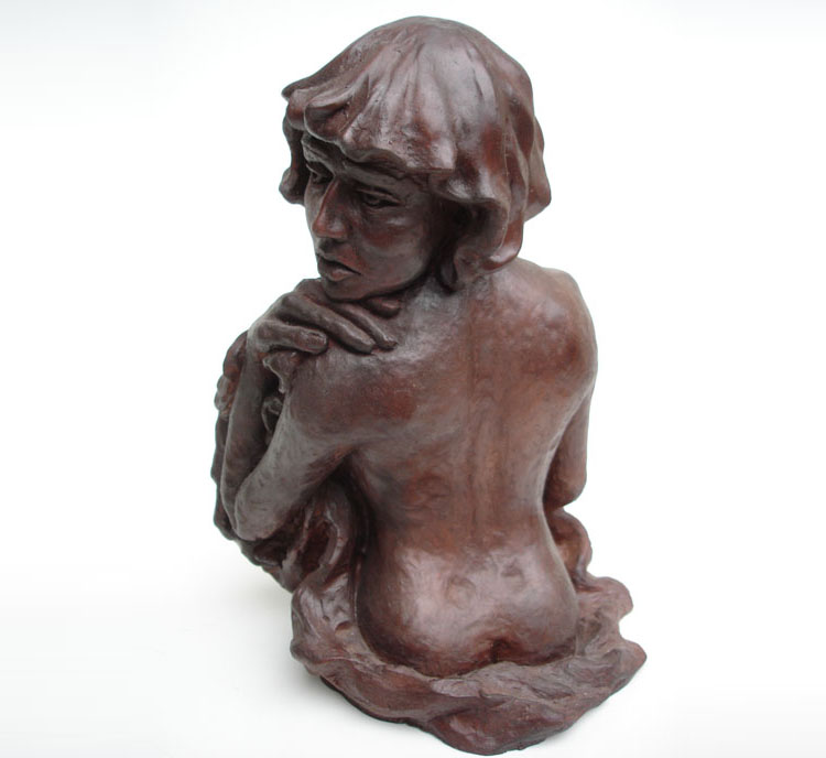 Escultura de nú feminino de costas. Modelagem executada com apenas um ponto de vista, focando a parte das costas, sendo que o outro lado, o frontal, permaneceu com a forma espontânea, gerada ao acaso durante a modelagem. Peça em mármore sintético com pátina marrom madeira.