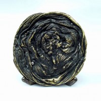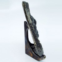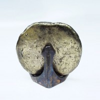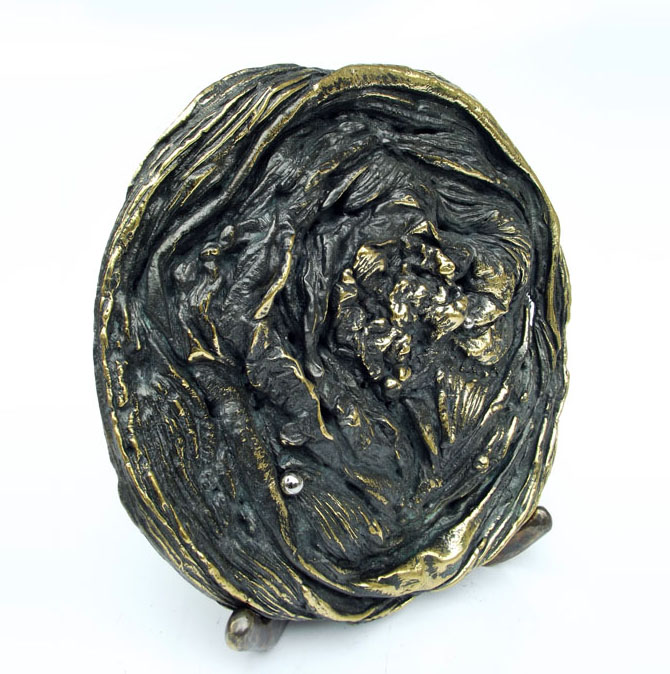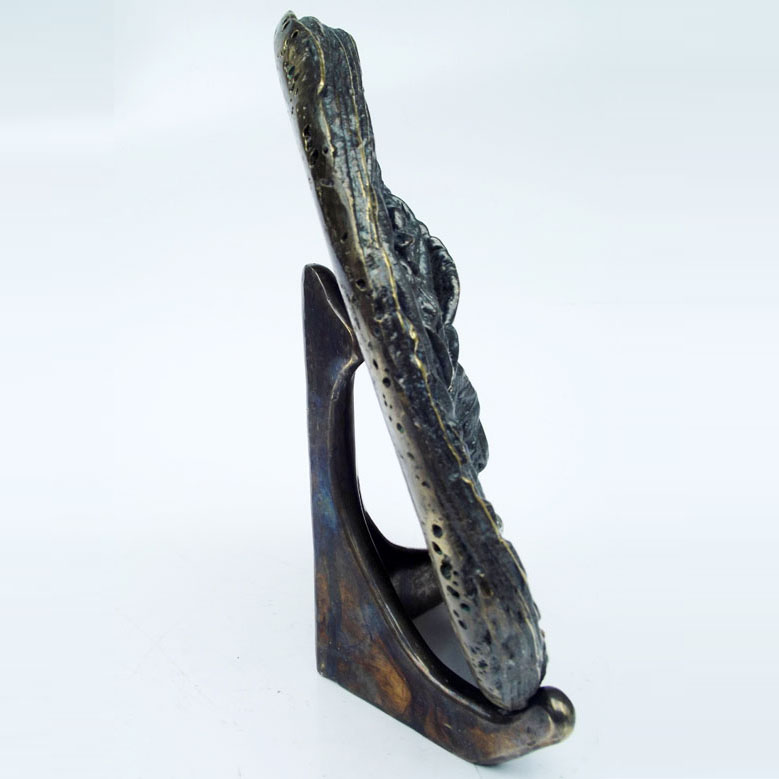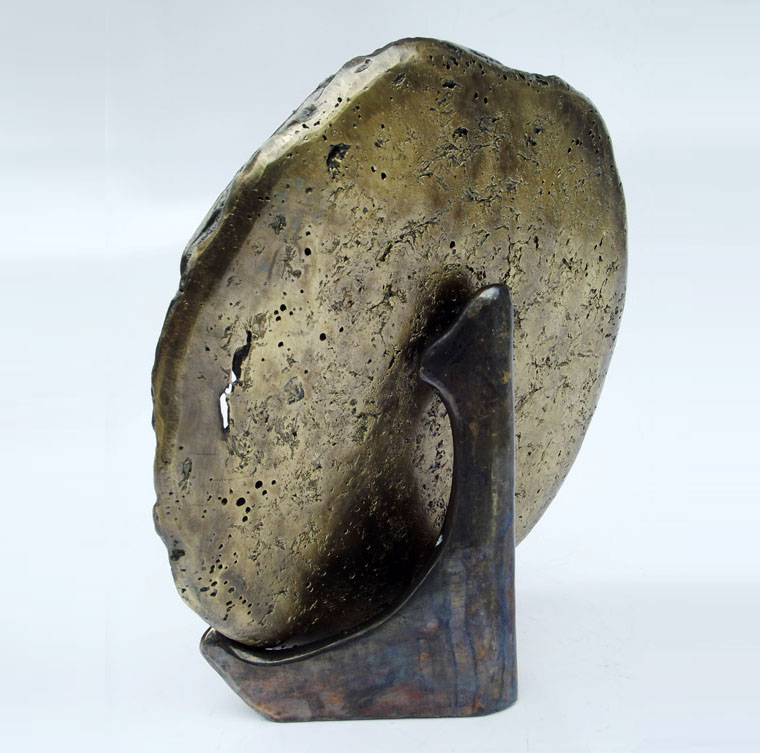 Descrição: Escultura de bronze com aplicação de esferas de aço, apoiada sobre tripé de bronze.