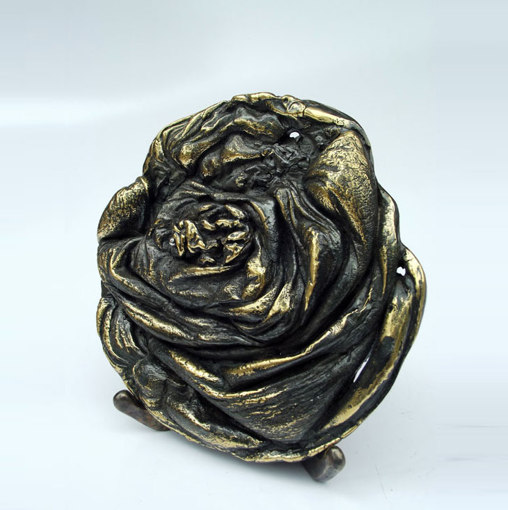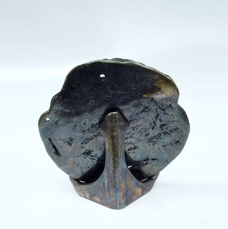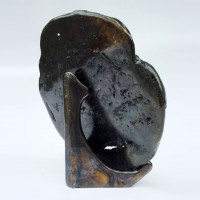 Descrição: Escultura de bronze com aplicação de esfera de aço, apoiada sobre tripé de bronze.