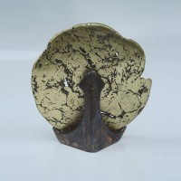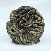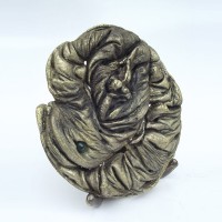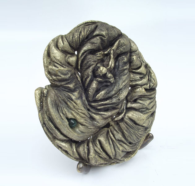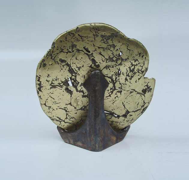 Descrição: Escultura de bronze com aplicação de ágata verde, apoiada sobre tripé de bronze.