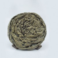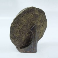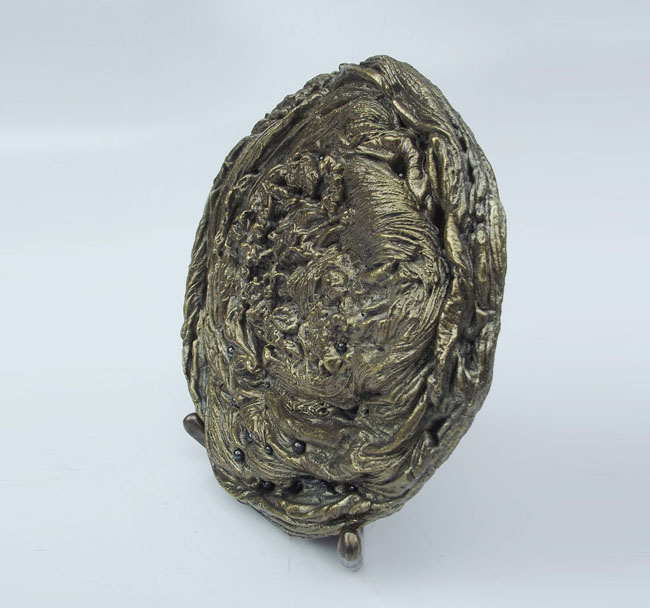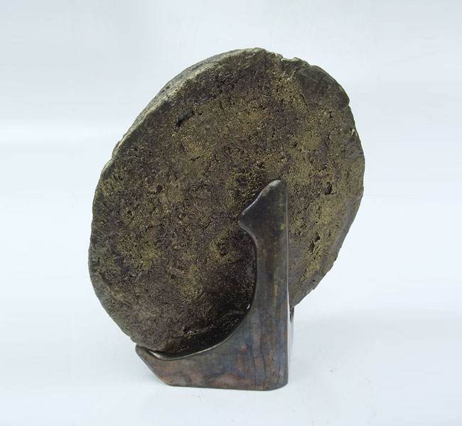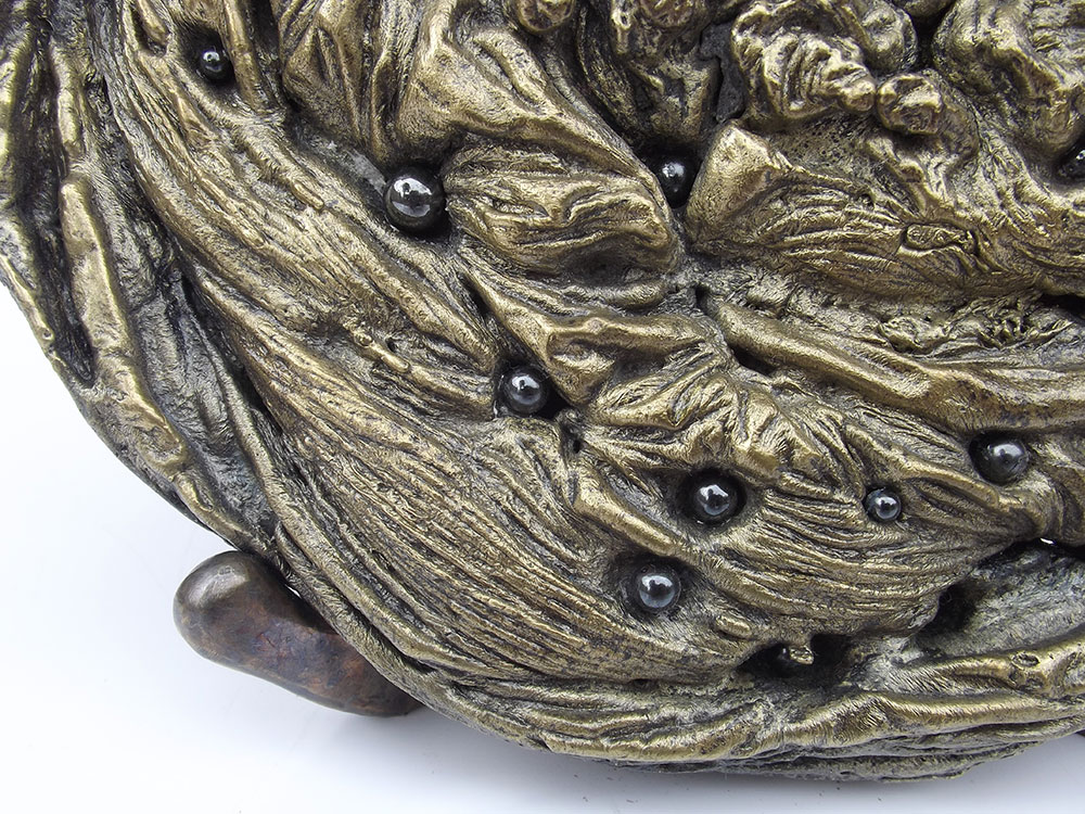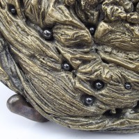 Descrição: Escultura de bronze com aplicação de esferas de hematita, apoiada sobre tripé de bronze.