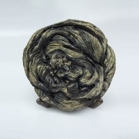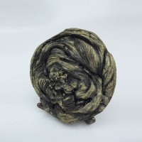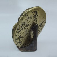 Descrição: Escultura de bronze com aplicação de esfera de hematita, apoiada sobre tripé de bronze.
