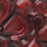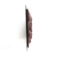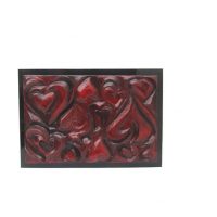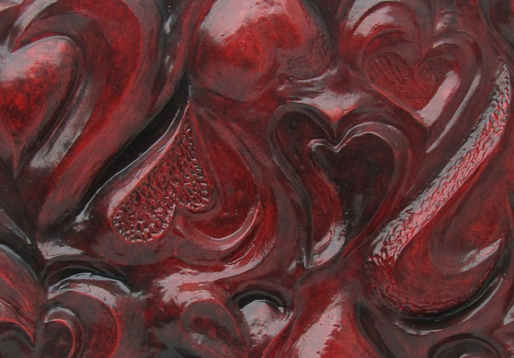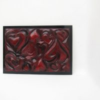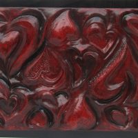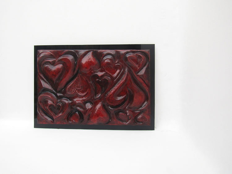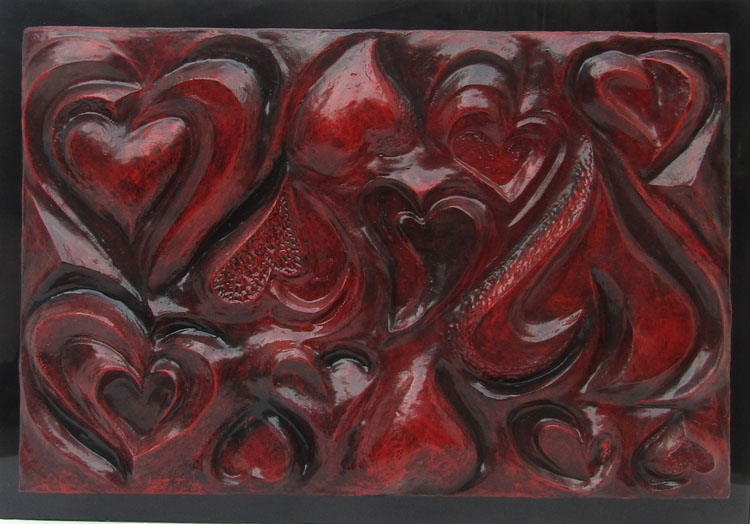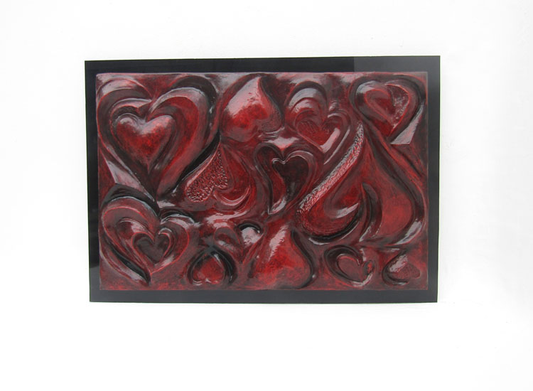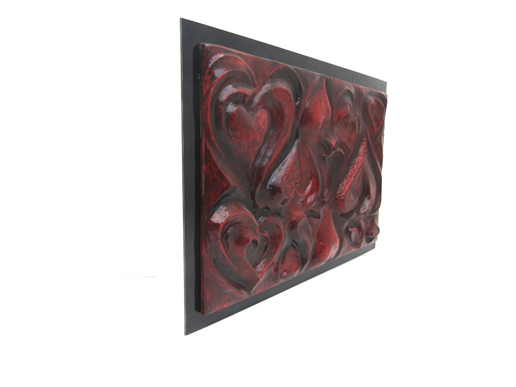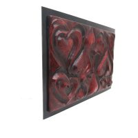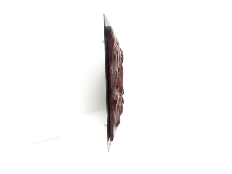 Painel tridimensional modelado e moldado por laminação em resina e fibra de vidro, fixado sobre moldura de ACM. Pintura acrílica em vermelho com pátina preta.