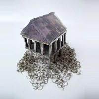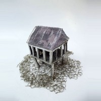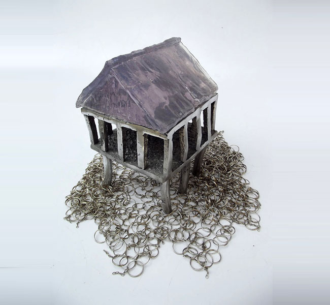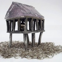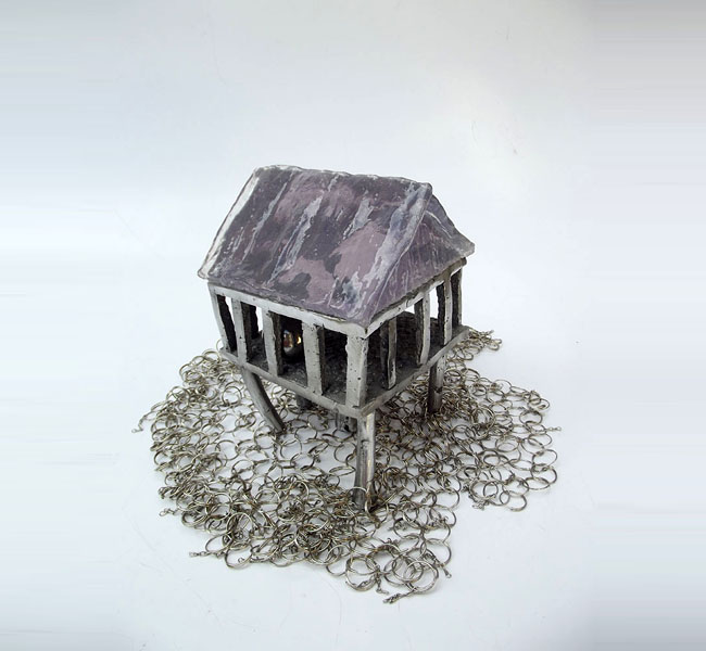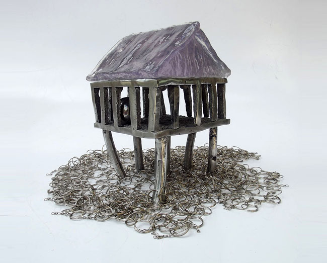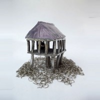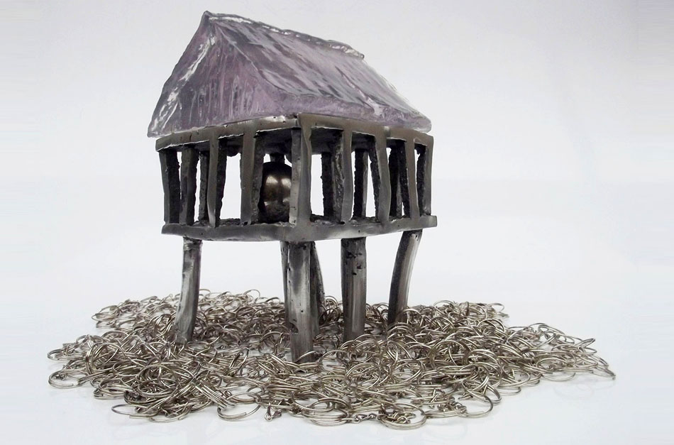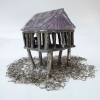 Descrição: Palafita de alumínio com 1 esfera de aço em seu interior e telhado de resina cristal sobre tecido de argolas de metal