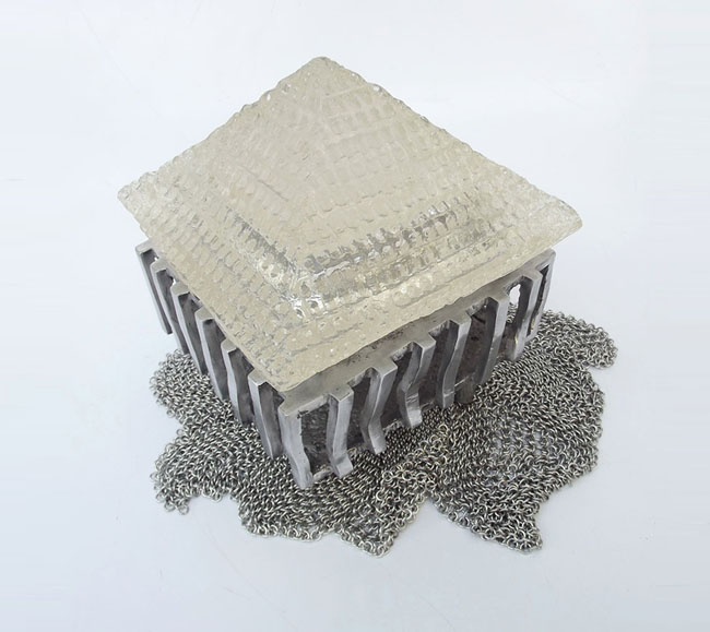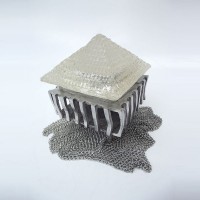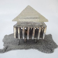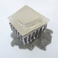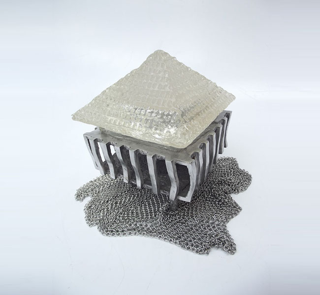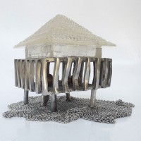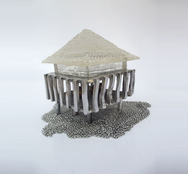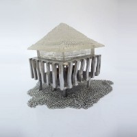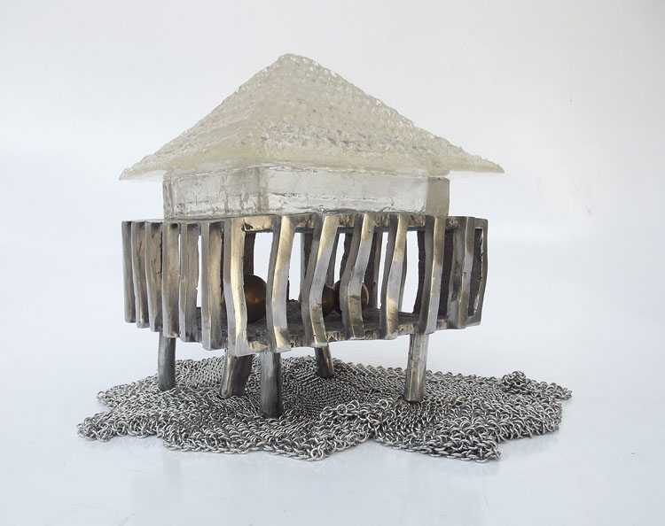 Descrição: Palafita de alumínio com 3 esferas de aço em seu interior e telhado de resina cristal sobre tecido de argolas de alumínio