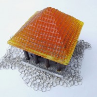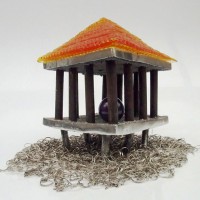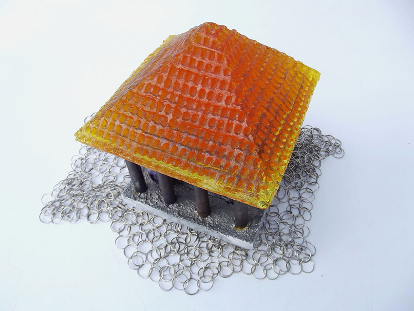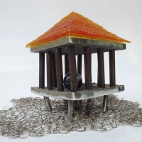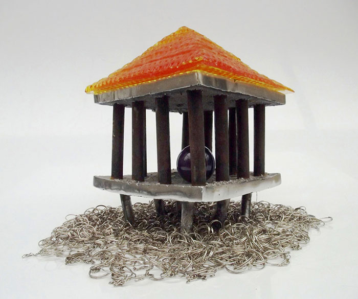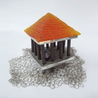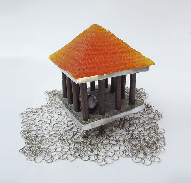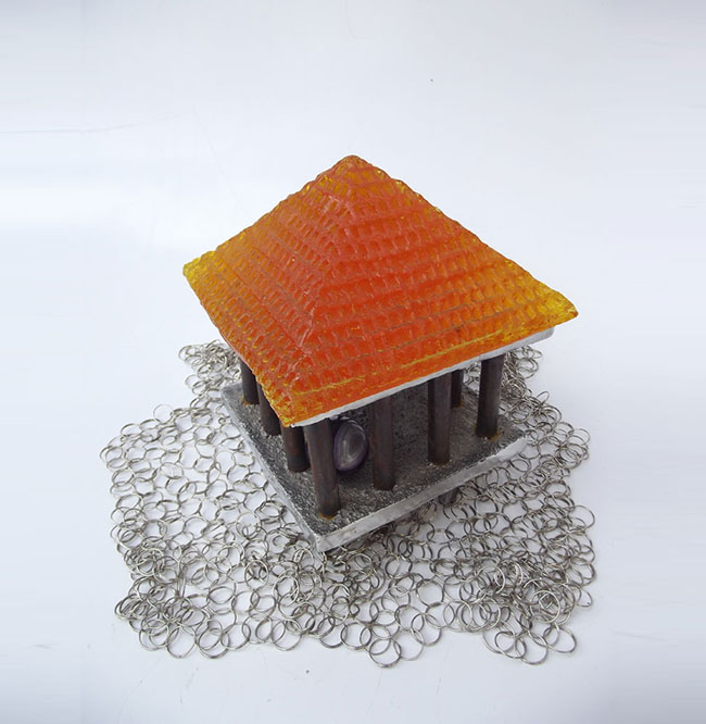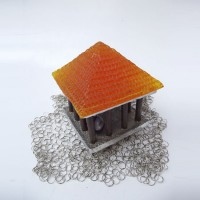 Descrição: Palafita de alumínio com grade de ferro, contendo 1 esfera de ágata polida em seu interior e telhado de resina amarelo vitral sobre tecido de argolas de metal.