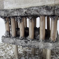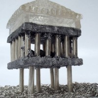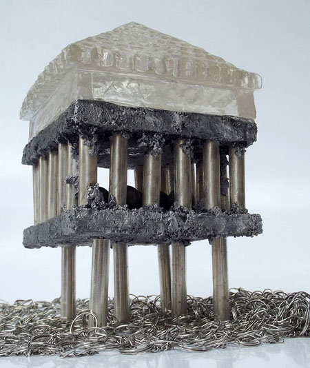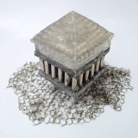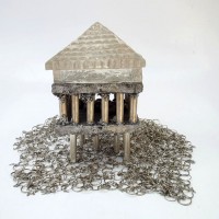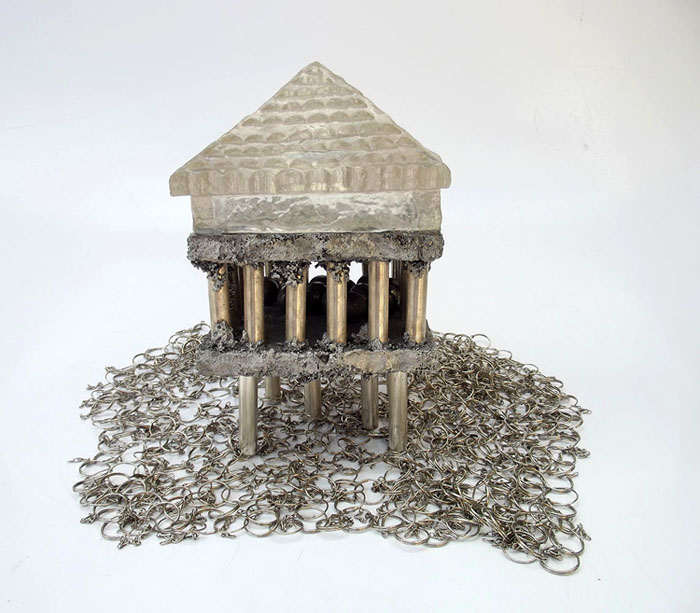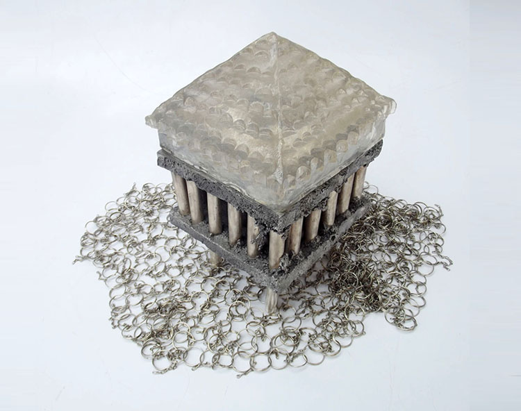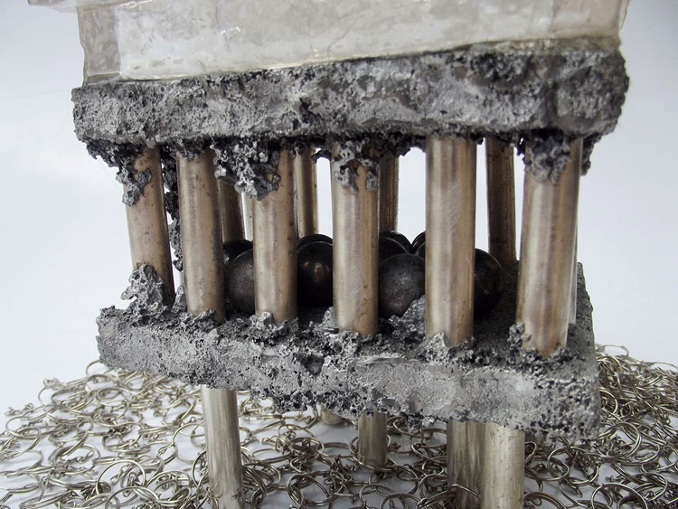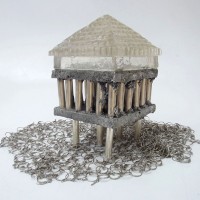 Descrição: Palafita de alumínio com grade de ferro com 12 esferas de aço inóx em seu interior e telhado de resina cristal, sobre tecido de argolas de metal