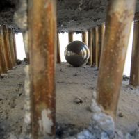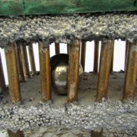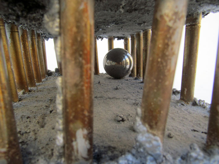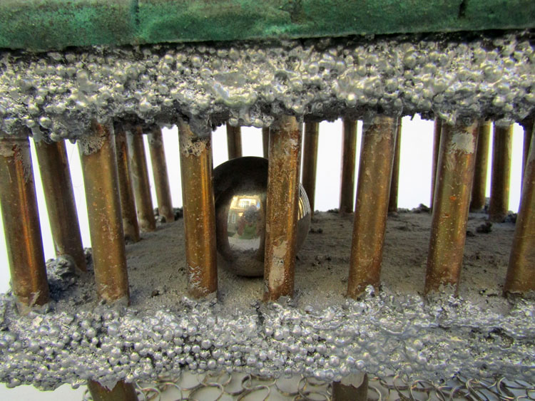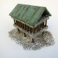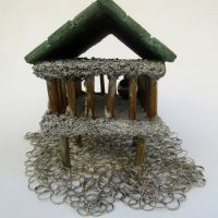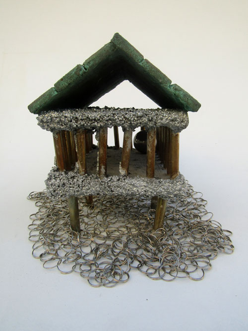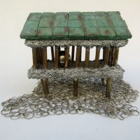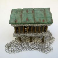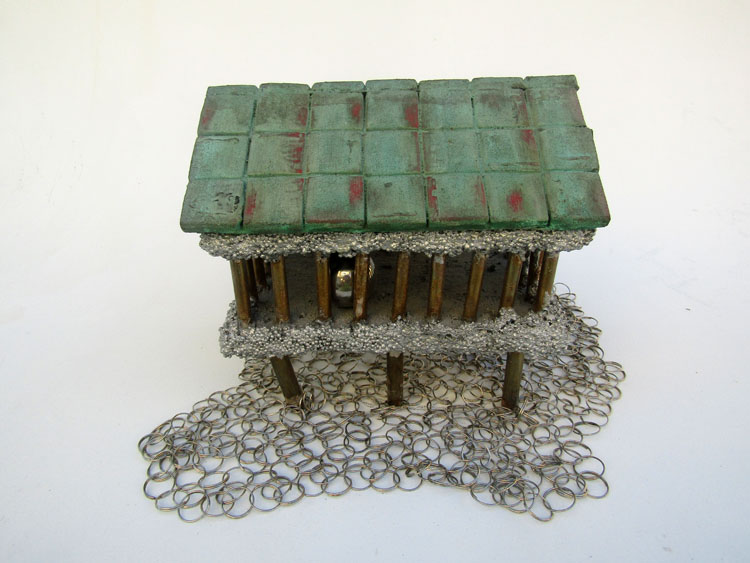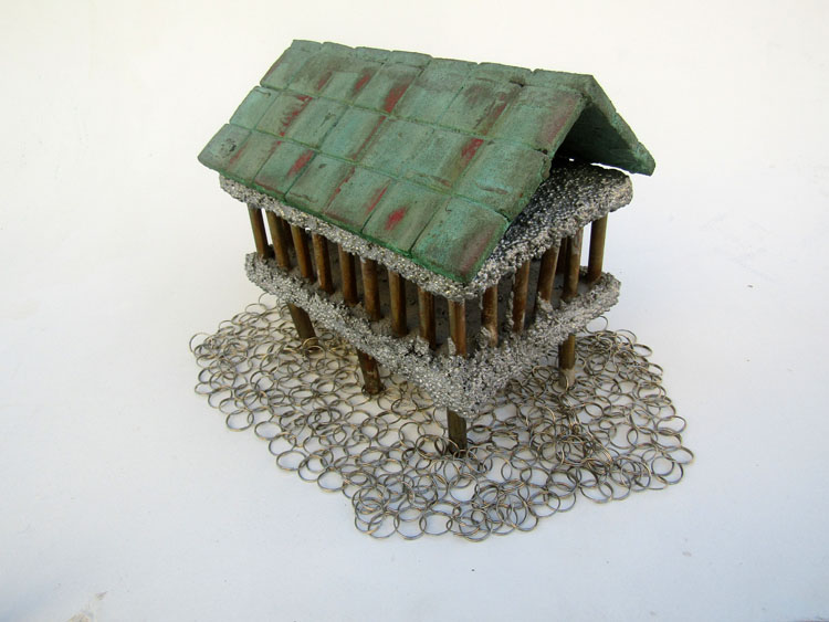 Descrição: Palafita de alumínio com grades de ferro contendo 1 esfera de aço em seu interior. Telhado de justaposição de quadrados vermelhos de resina com pátina quente bronze verde. Base flexível em tecido de argolas de metal.