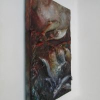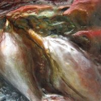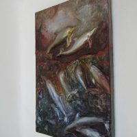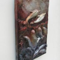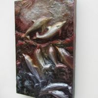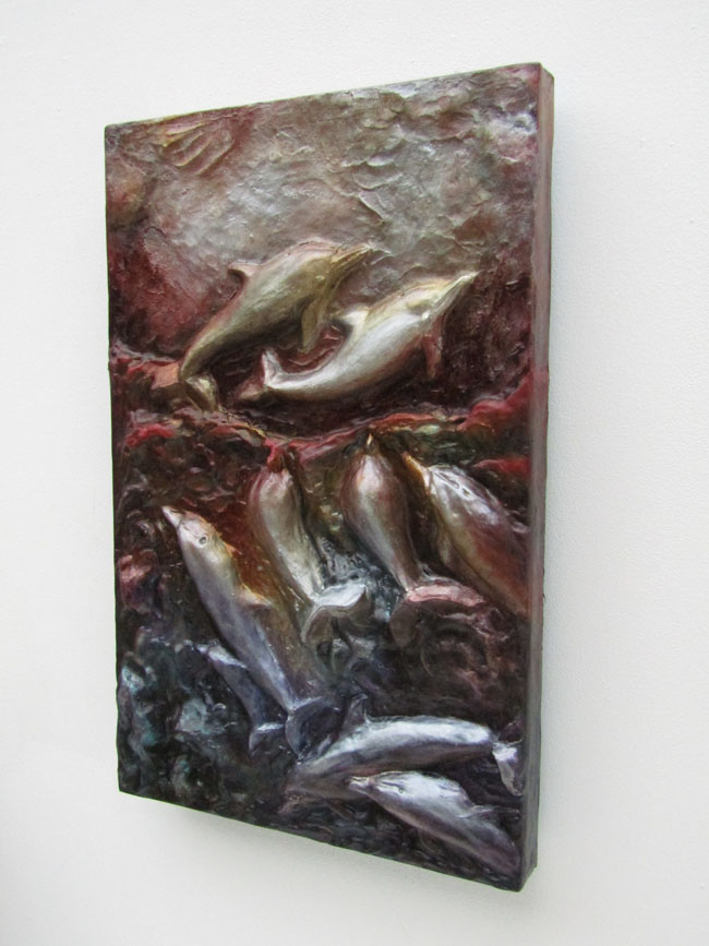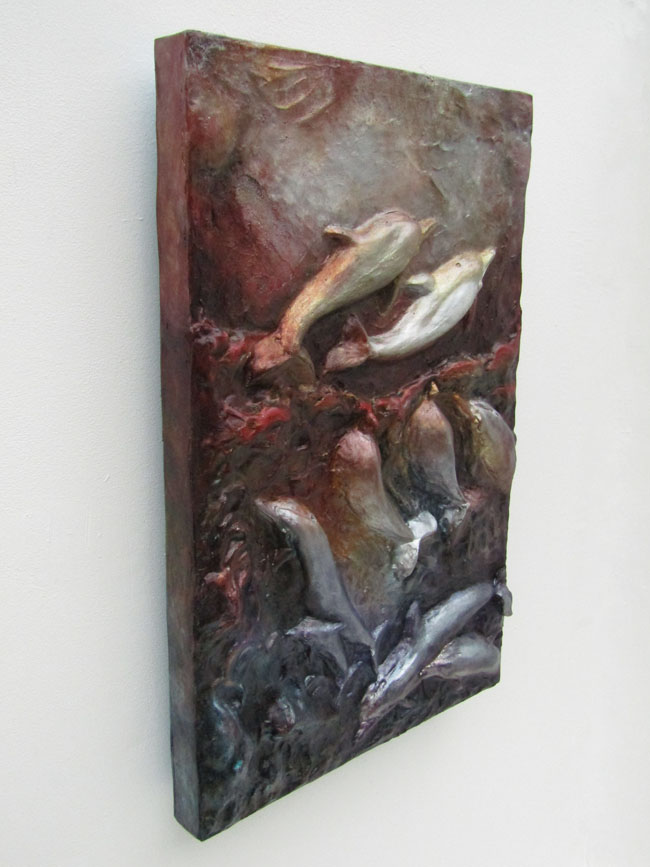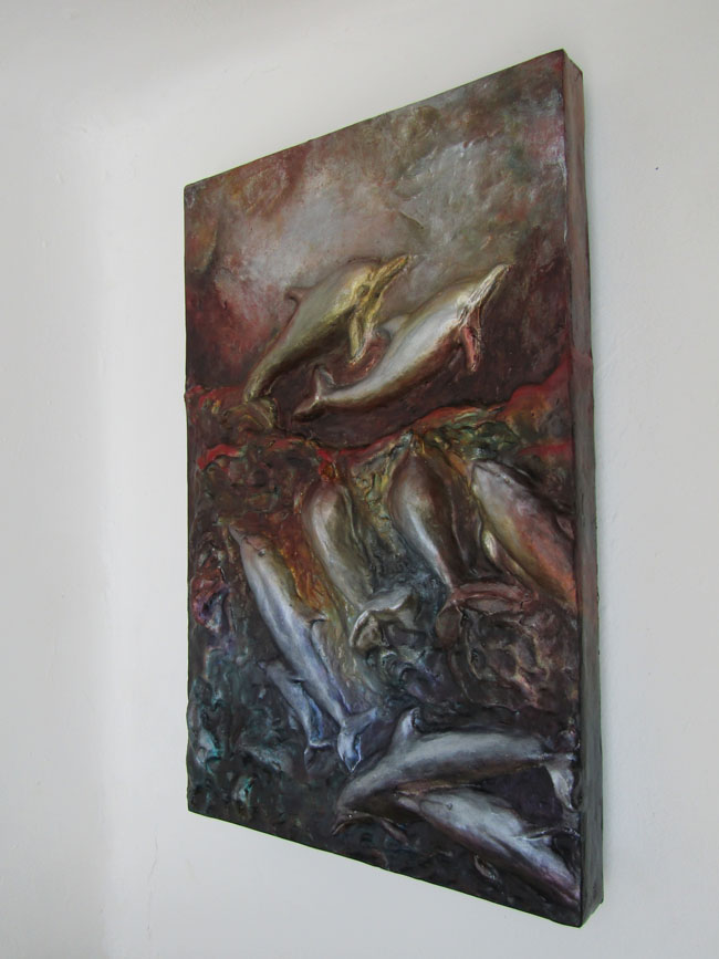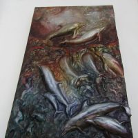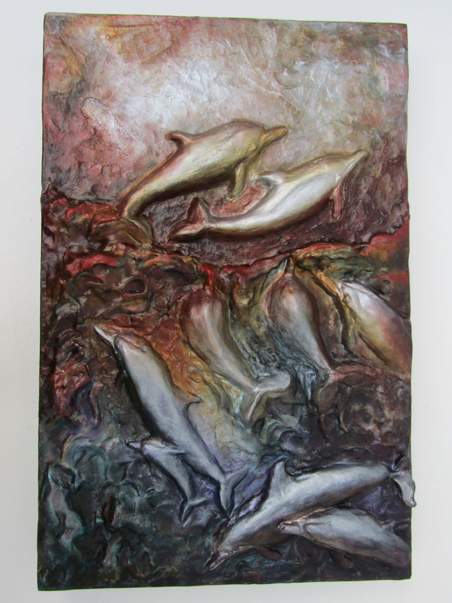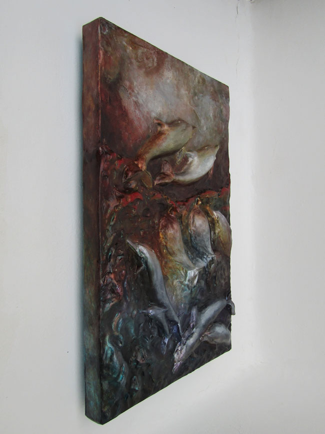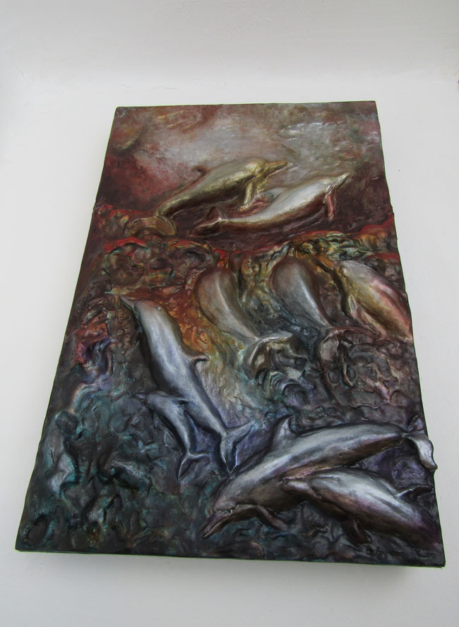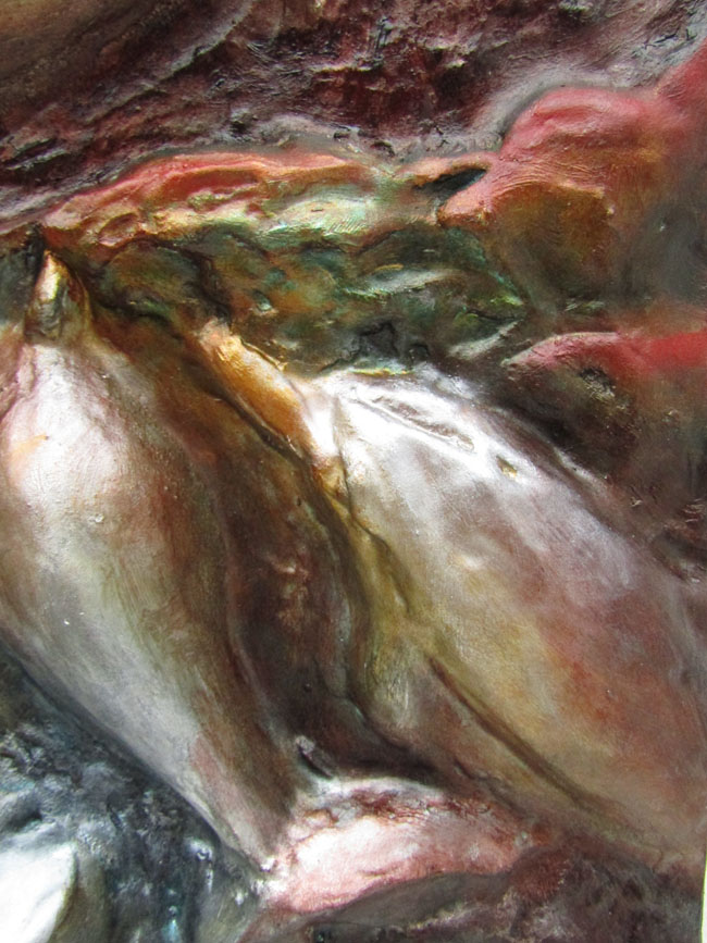 Painel tridimensional modelado e moldado por laminação em resina e fibra de vidro com pintura acrílica.