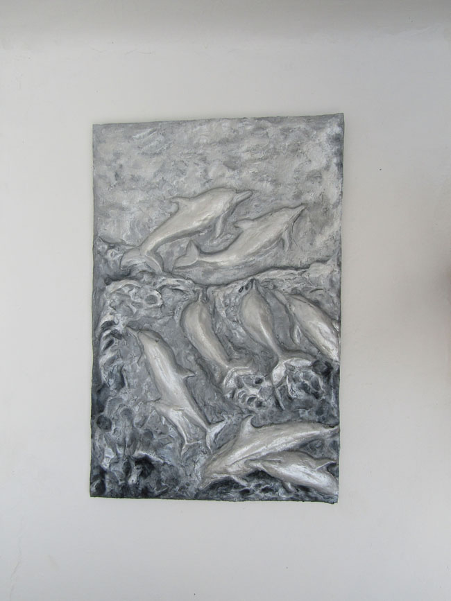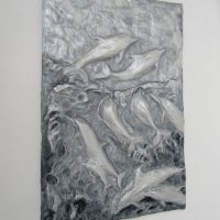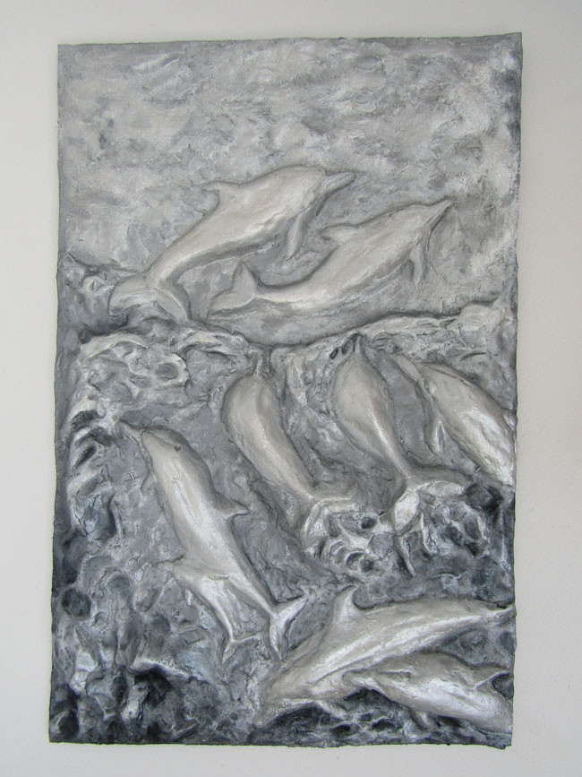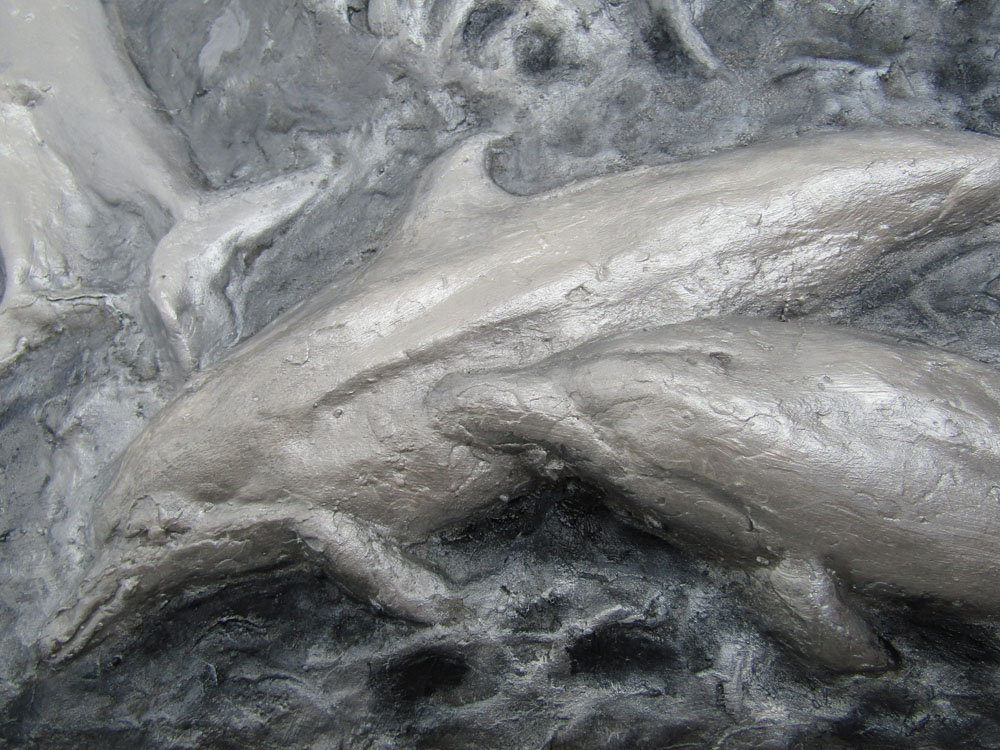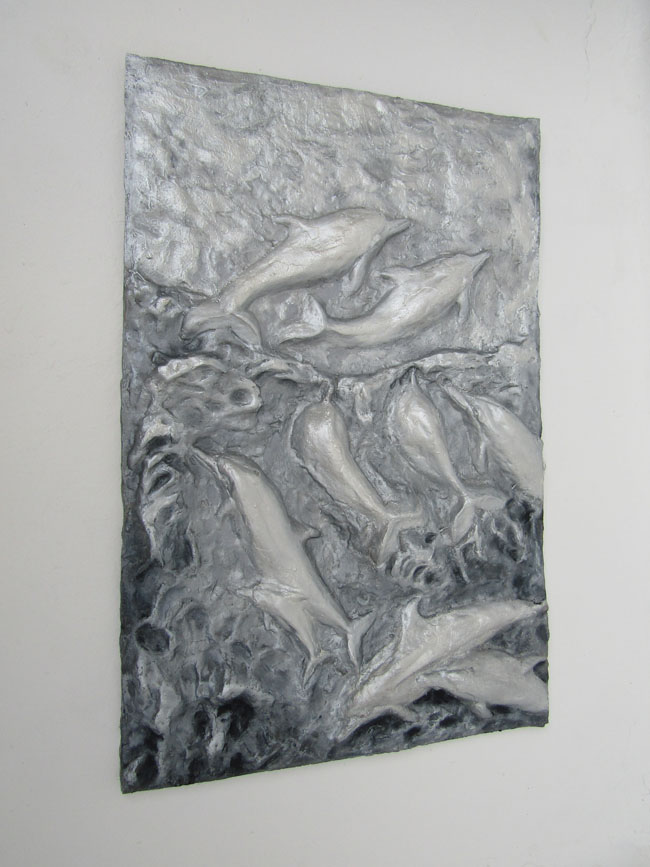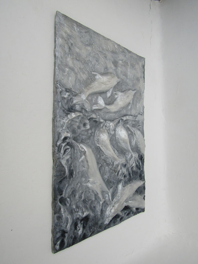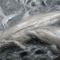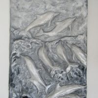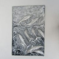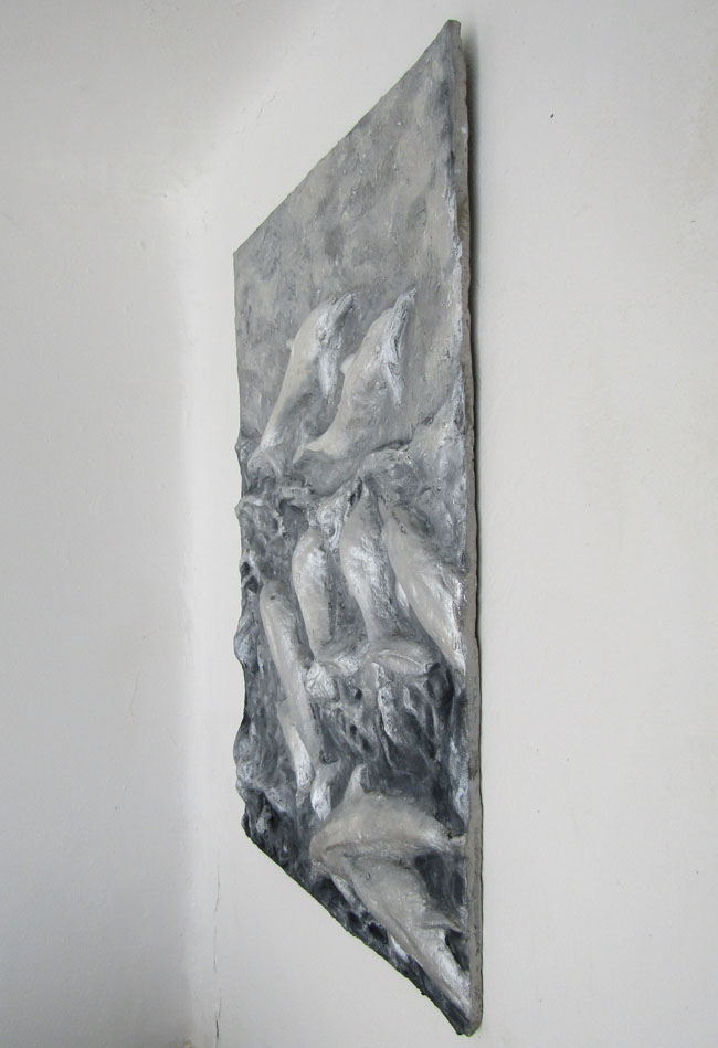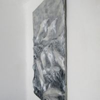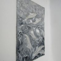 Painel tridimensional em alumínio com pintura acrílica em tons de cinza.