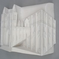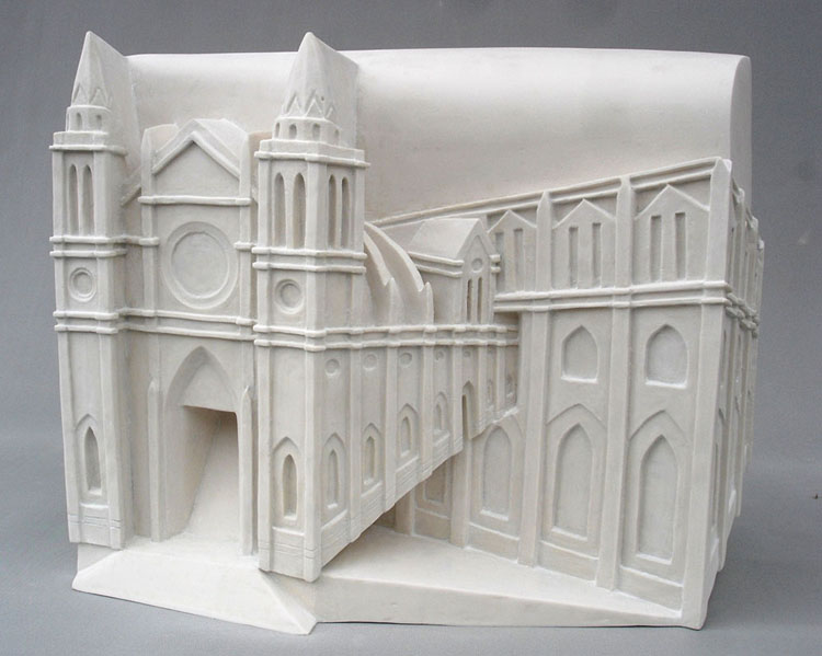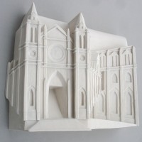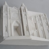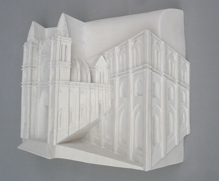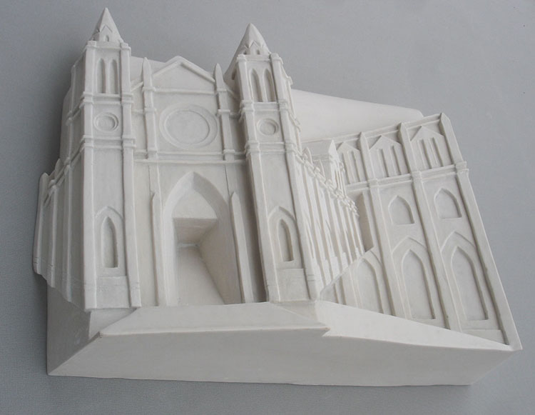 Descrição: Releitura da arquitetura da Catedral Metropolitana de Curitiba. Executada em marmorite, laminada com fibra de vidro. Obra de parede.