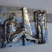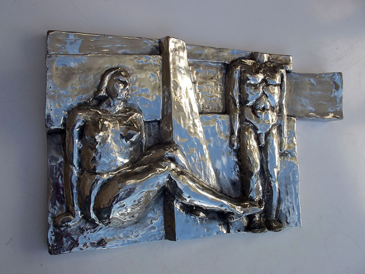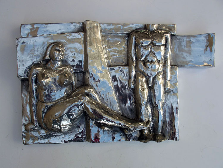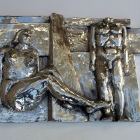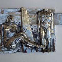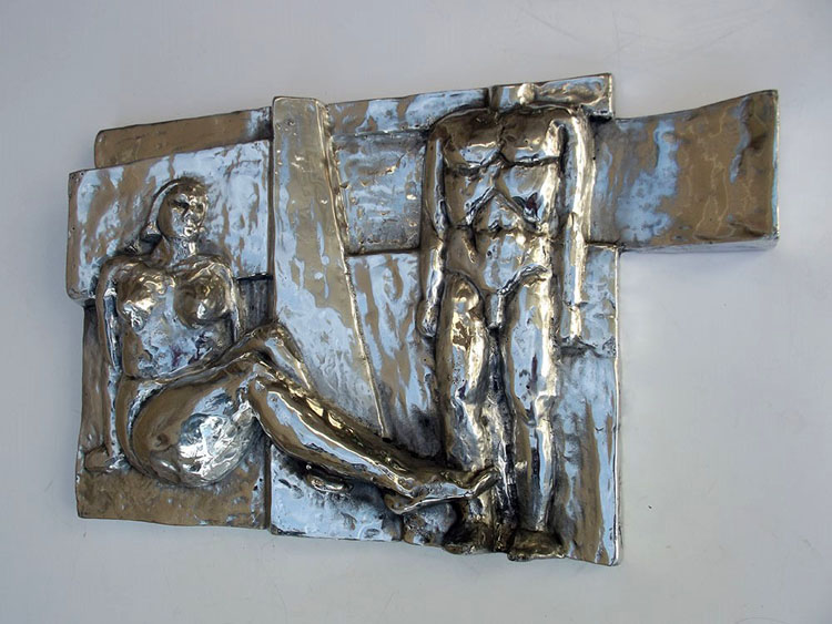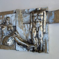 Descrição: Escultura de alumínio em auto-relevo, releitura da Praça do Homem Nu. Obra de parede, pendurada por cabo de aço.