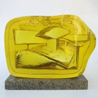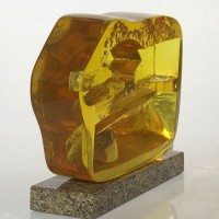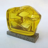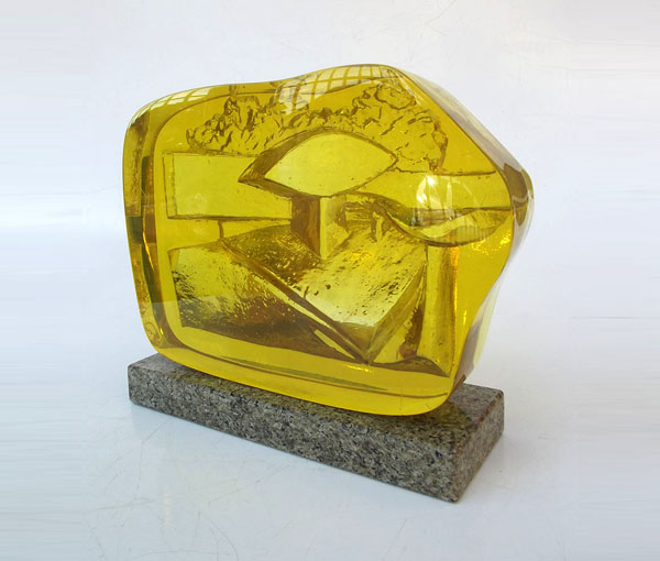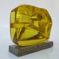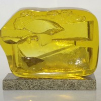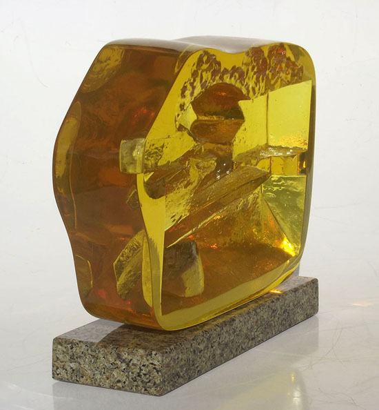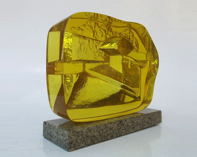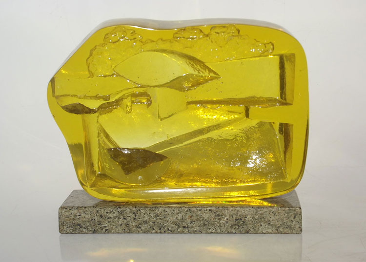 Descrição: Escultura em resina de poliéster amarelo vitral, sobre base de granito (não fixada).