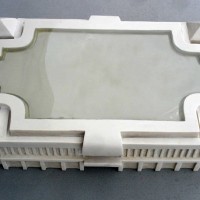 Descrição: Releitura da arquitetura do Parque Tanguá em Curitiba. Executada em marmorite, laminada com fibra de vidro. Obra de mesa.